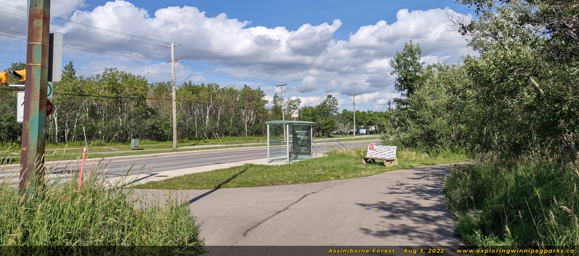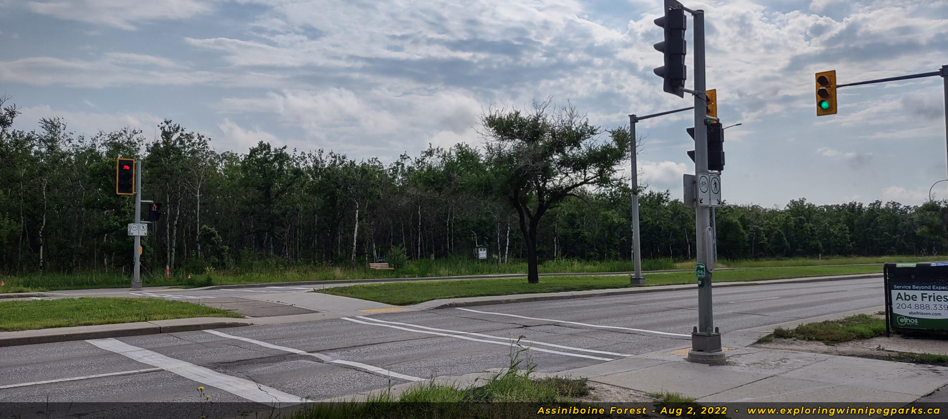 The Assiniboine Forest covers a large area, flanking either side of Grant Ave between Chalfont Rd and Shaftesbury Blvd. A number of trails are available throughout the forested area, with the main trail beginning south of the Assiniboine Park Zoo, and running south and east to the corner of Wilkes Ave and Shaftebury Blvd. The Harte Trail runs east-west along the south edge of the forest.