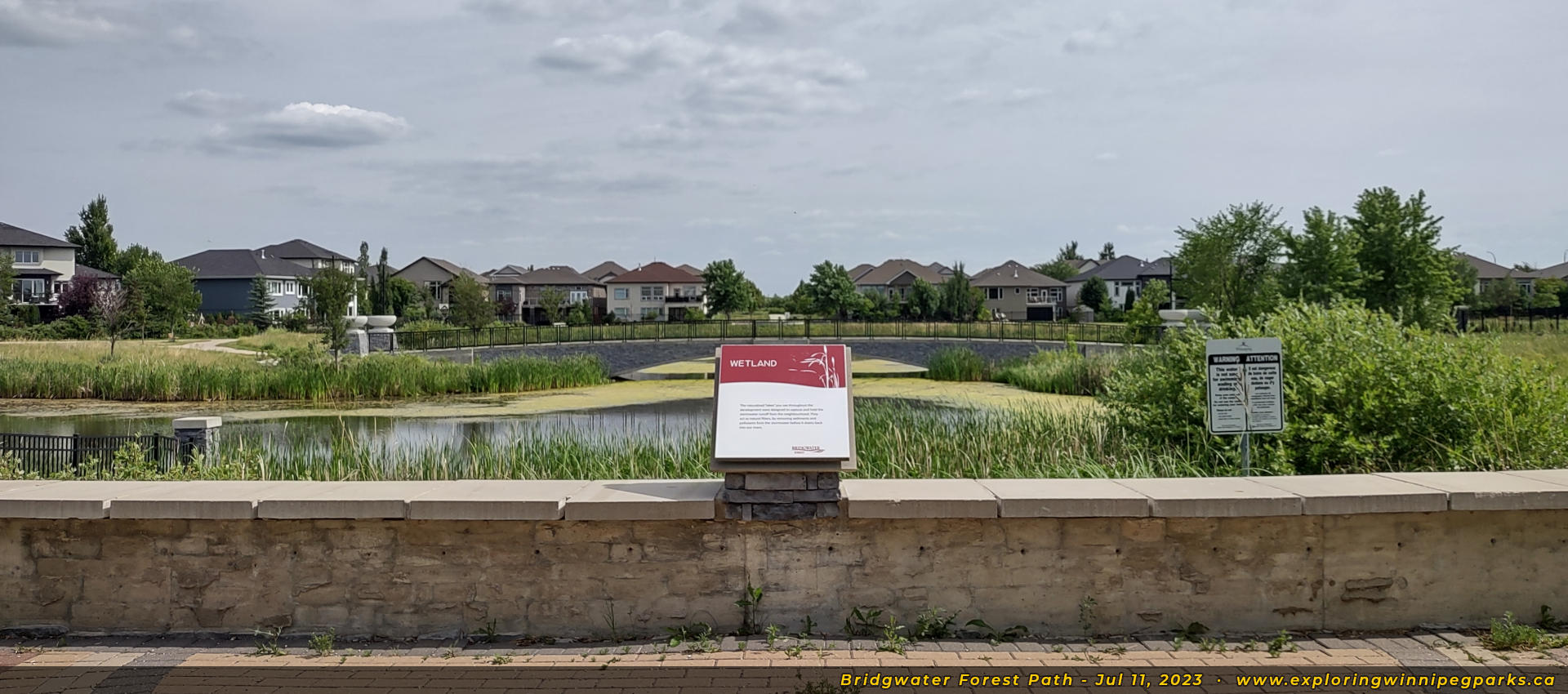 Bridgwater Forest Path is located in the center of the Bridgwater Forest neighbourhood, sandwiched between Highland Creek Rd and Maple Creek Rd. A long pathway runs alongside a pond through the park, with a footbridge in the center.