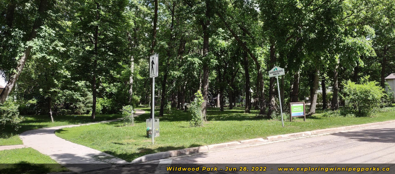 Wildwood Park weaves through the tree canopy behind the many bays to the southeast of Oakenwald Ave and Wildwood St. There are many pathways and entrances, with three separate playgrounds.