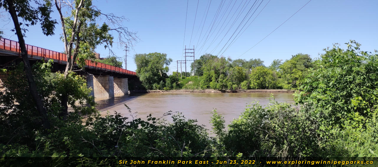 Sir John Franklin Park East sits on the south shore of the Assiniboine River, found at the north end of Renfrew St along Wellington Cres. There's an open area with a pathway leading through to a narrow footbridge over Assiniboine River.