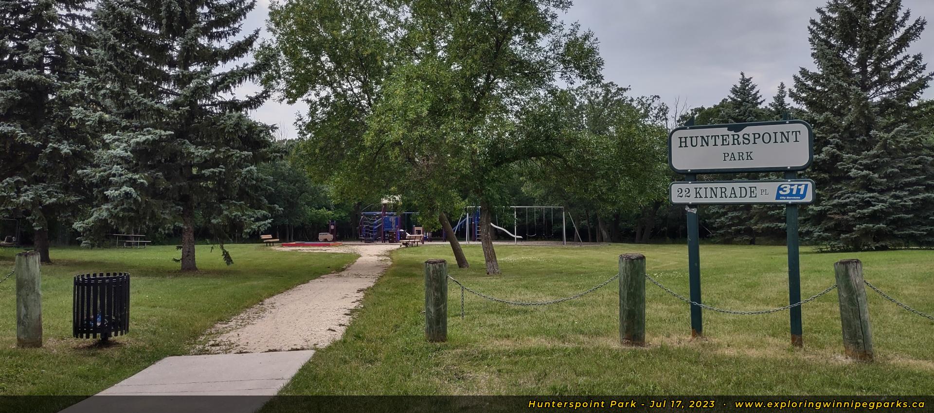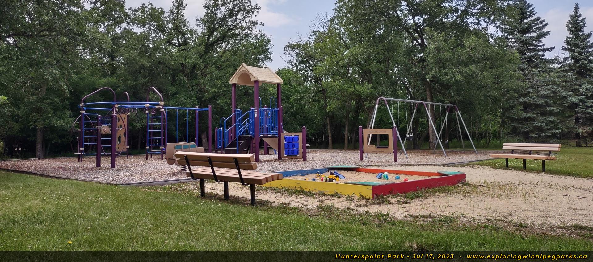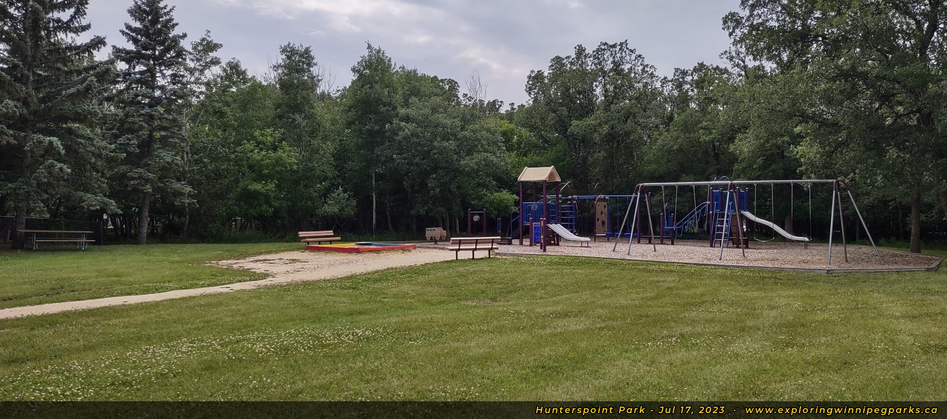 Hunterspoint Park sits at the west end of Kinrade Pl, off the west side of Hunterspoint Rd. There's a playground with plenty of seating, and a small open area.