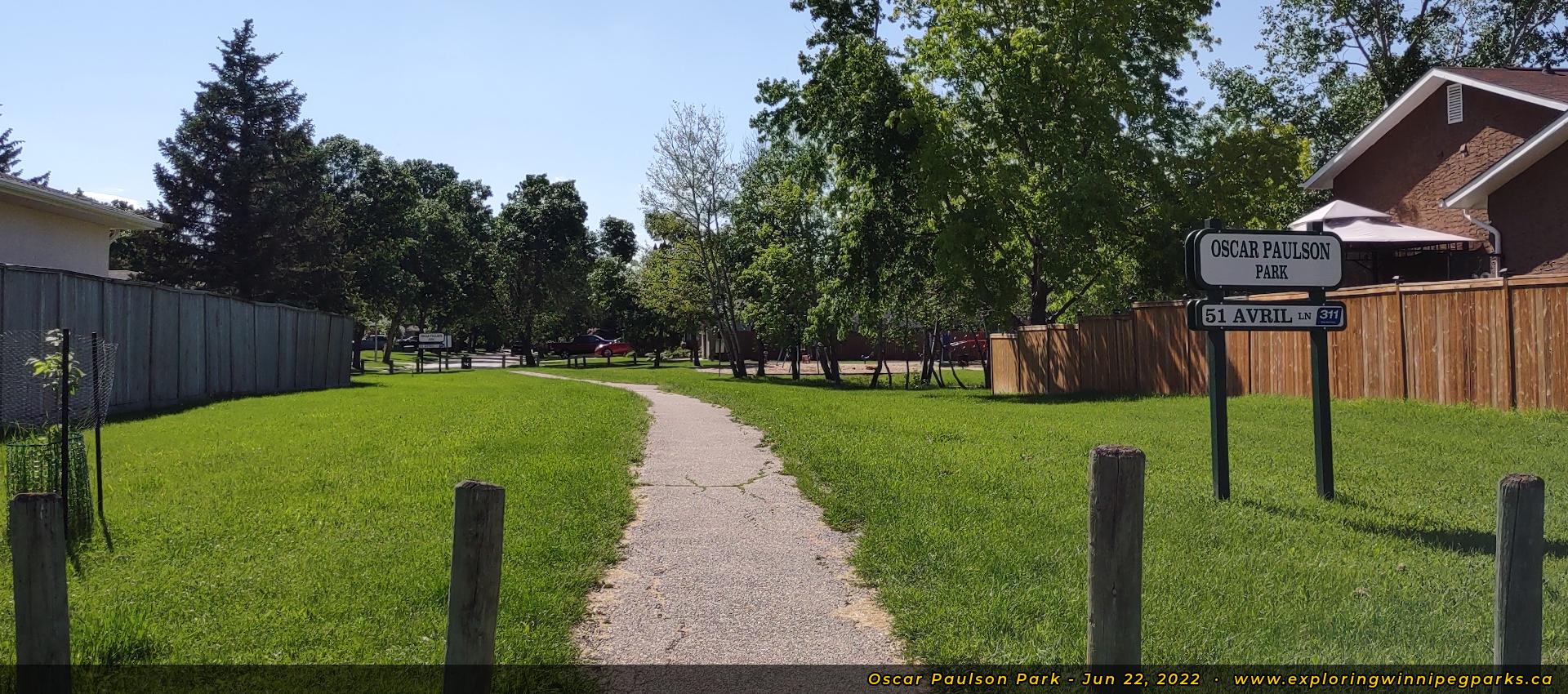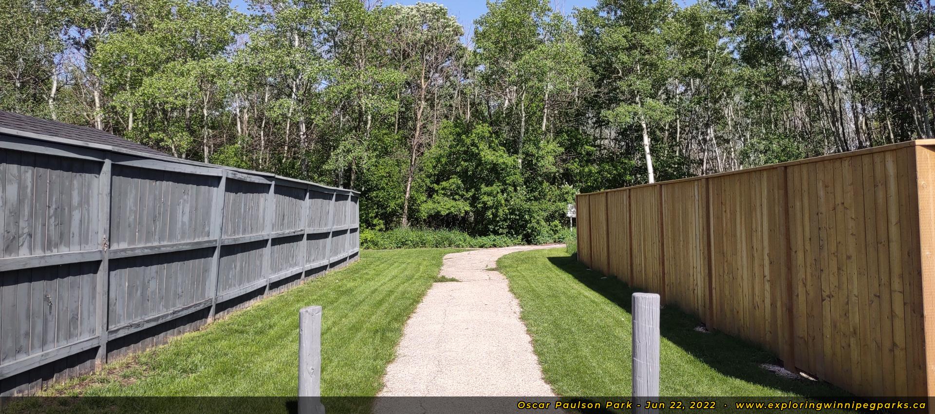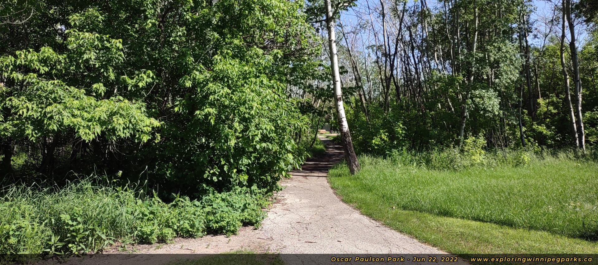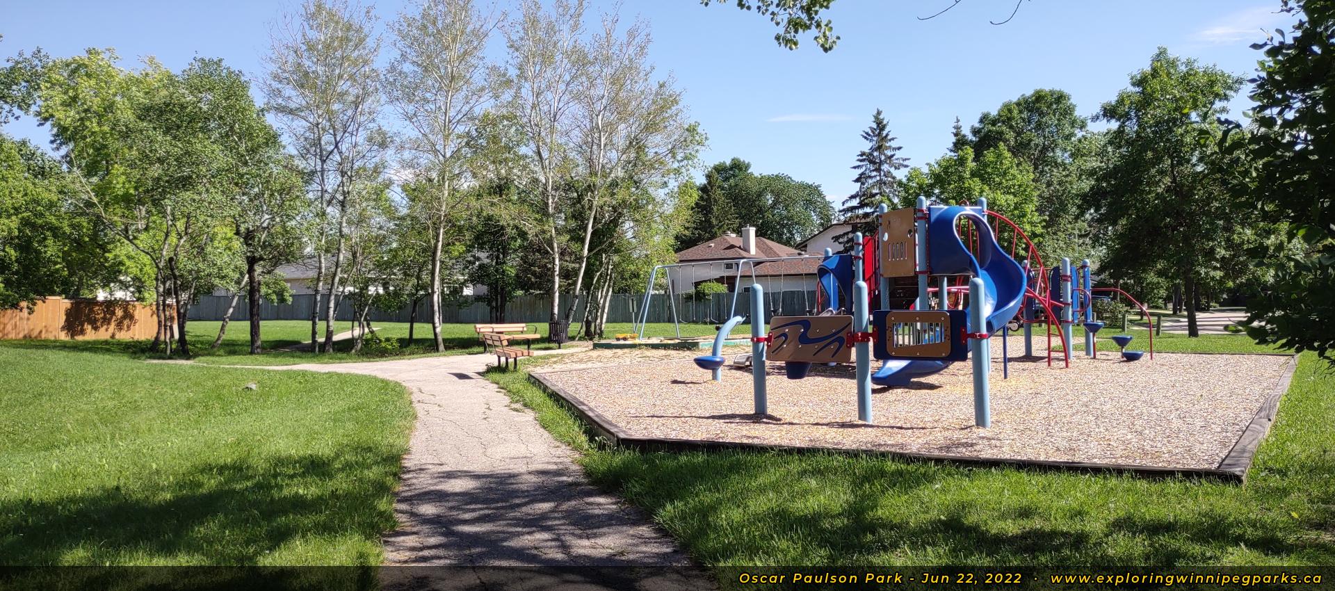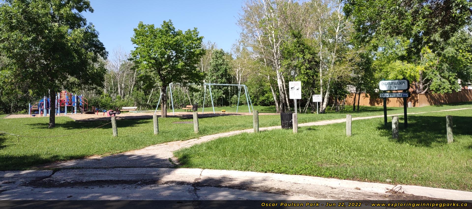 Oscar Paulson Park is nestled in a forested area between Avril Ln and Epsom Cres. Several pathways wind through the trees on their way to a playground.