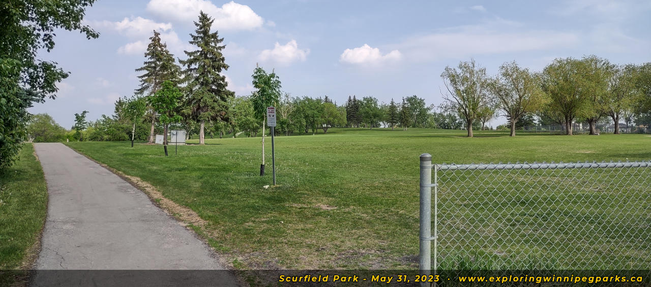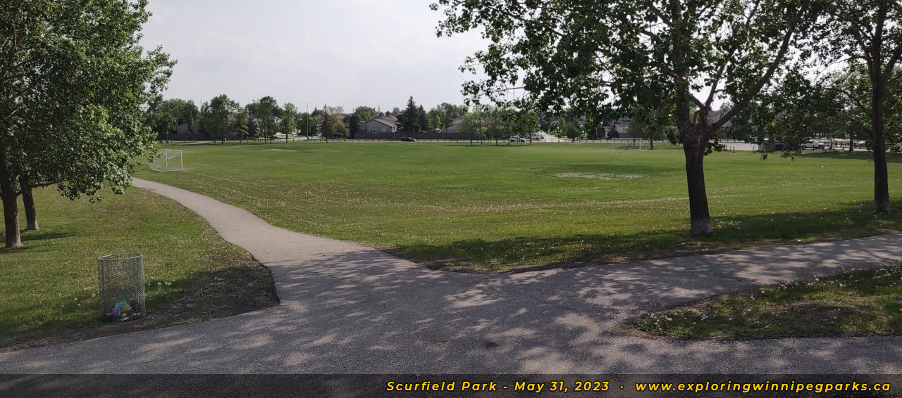 Welcome to Scurfield Park! Visitors can wander into the park off Columbia Dr, where several athletic fields await. Facing north.