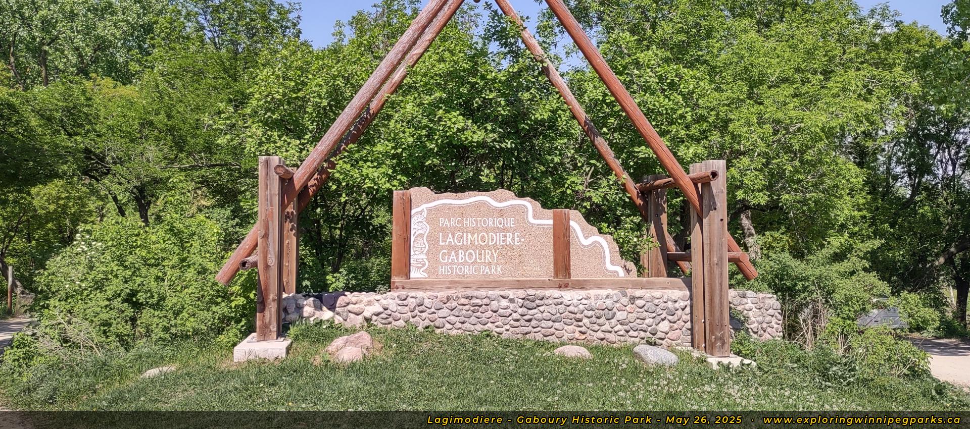 Welcome to Lagimodiere - Gaboury Historic Park! The entrance sign greets visitors at the east end of Notre Dame St, just off Thibault St.