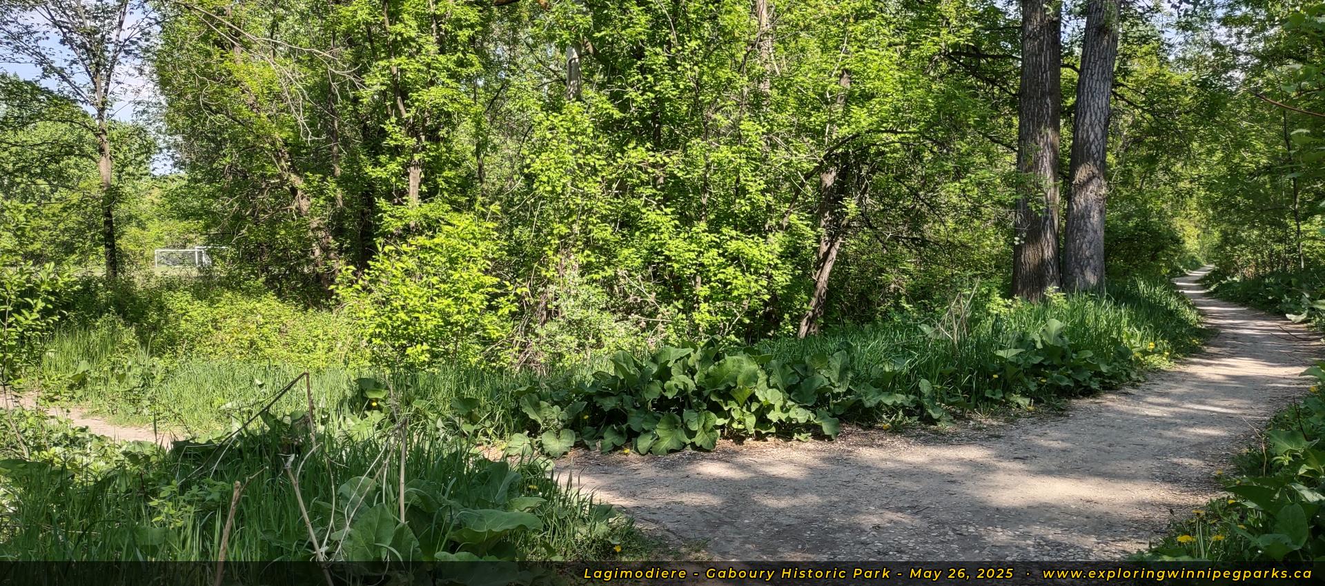 Just east of the parking loop, the pathways leading into the park diverge. The left biking trail leads towards a soccer field, while the right pathway runs along the Seine River.
