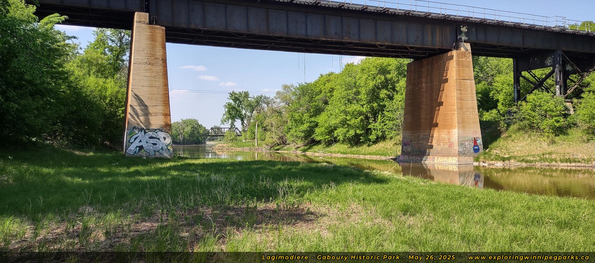 Near the northeast corner of the park, a dirt trail leads down to the bank Seine River as it flows north under the rail tracks into the Red River.