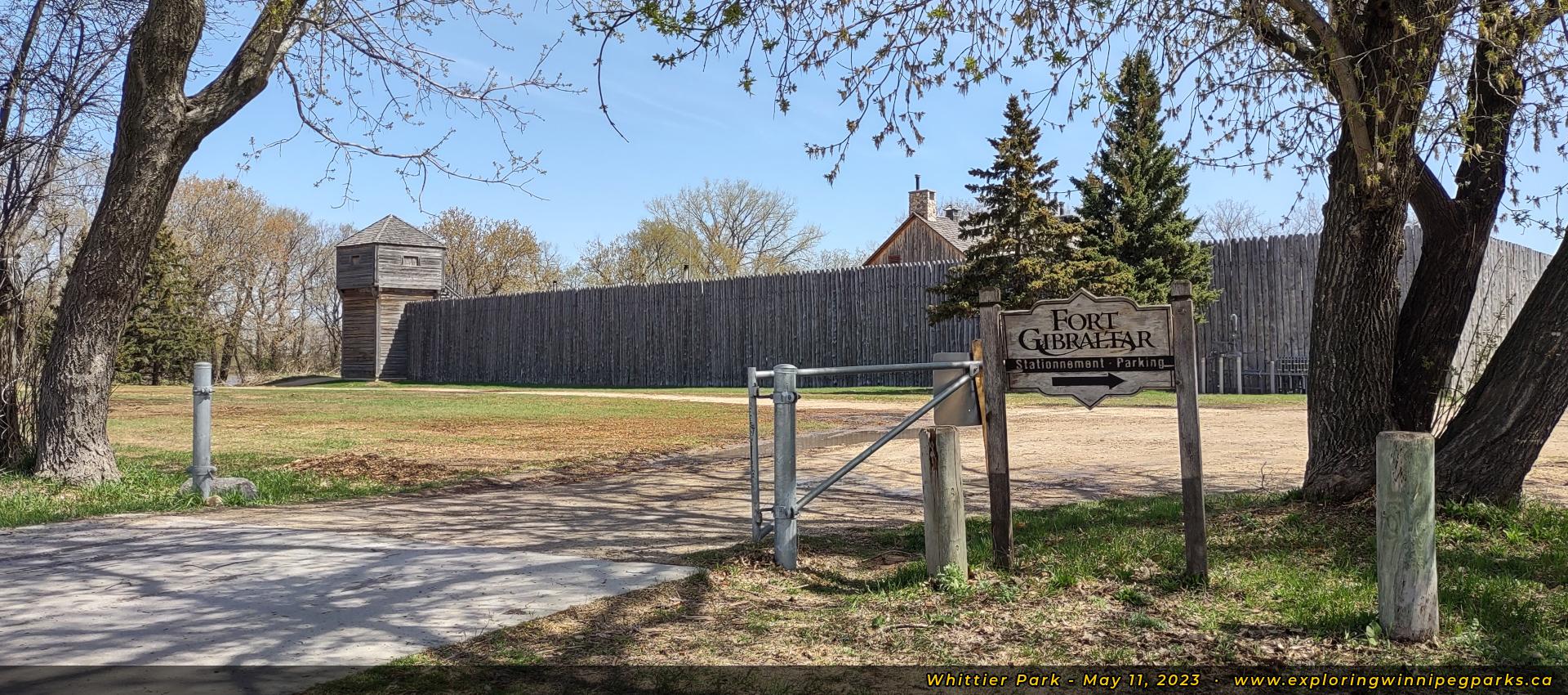Welcome to Whittier Park! The park sign stands near the entrance to the parking lot at Joseph St and Jibby St, with the historic Fort Gibraltar standing in the distance. Facing northeast.