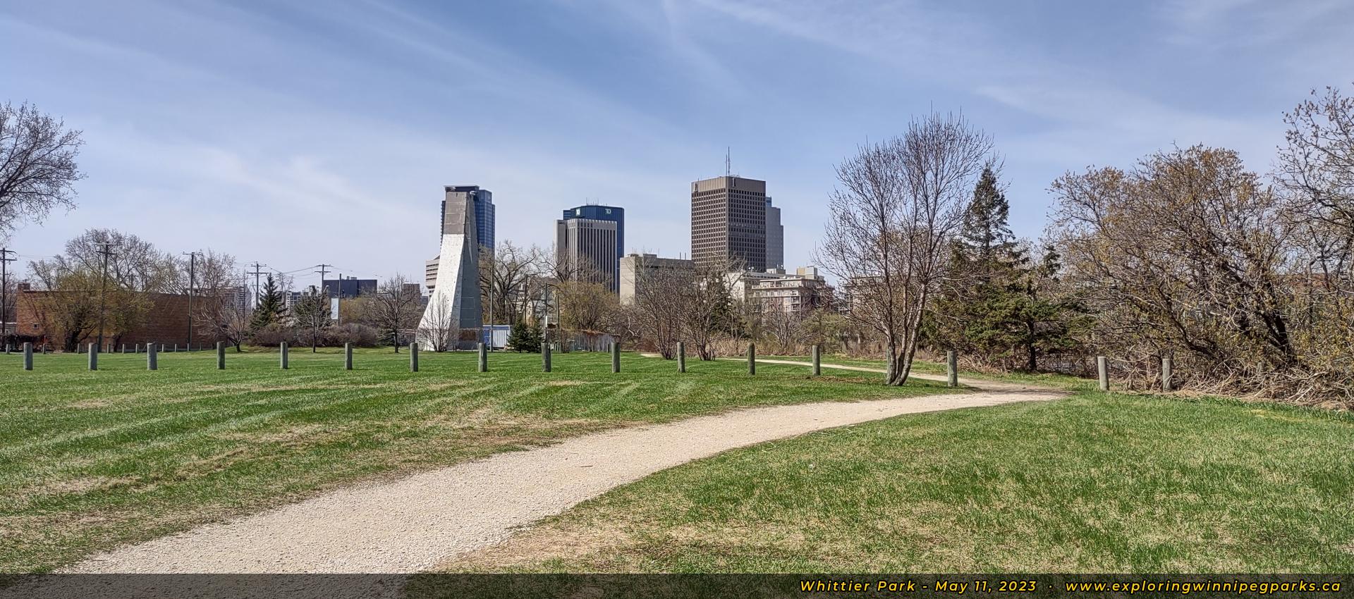 The pathway in the northwest corner of the park leads towards the ice climbing tower, offering a view of the downtown skyline. Facing west.