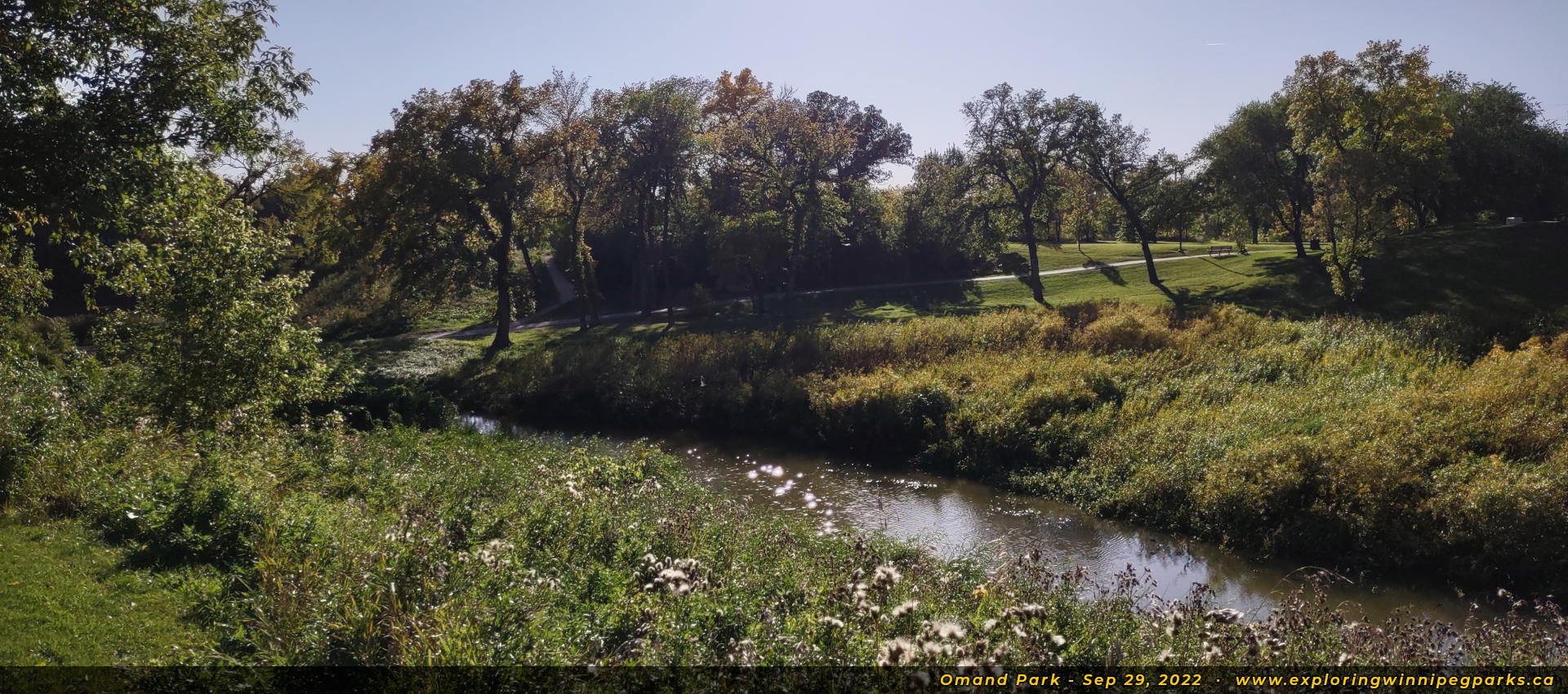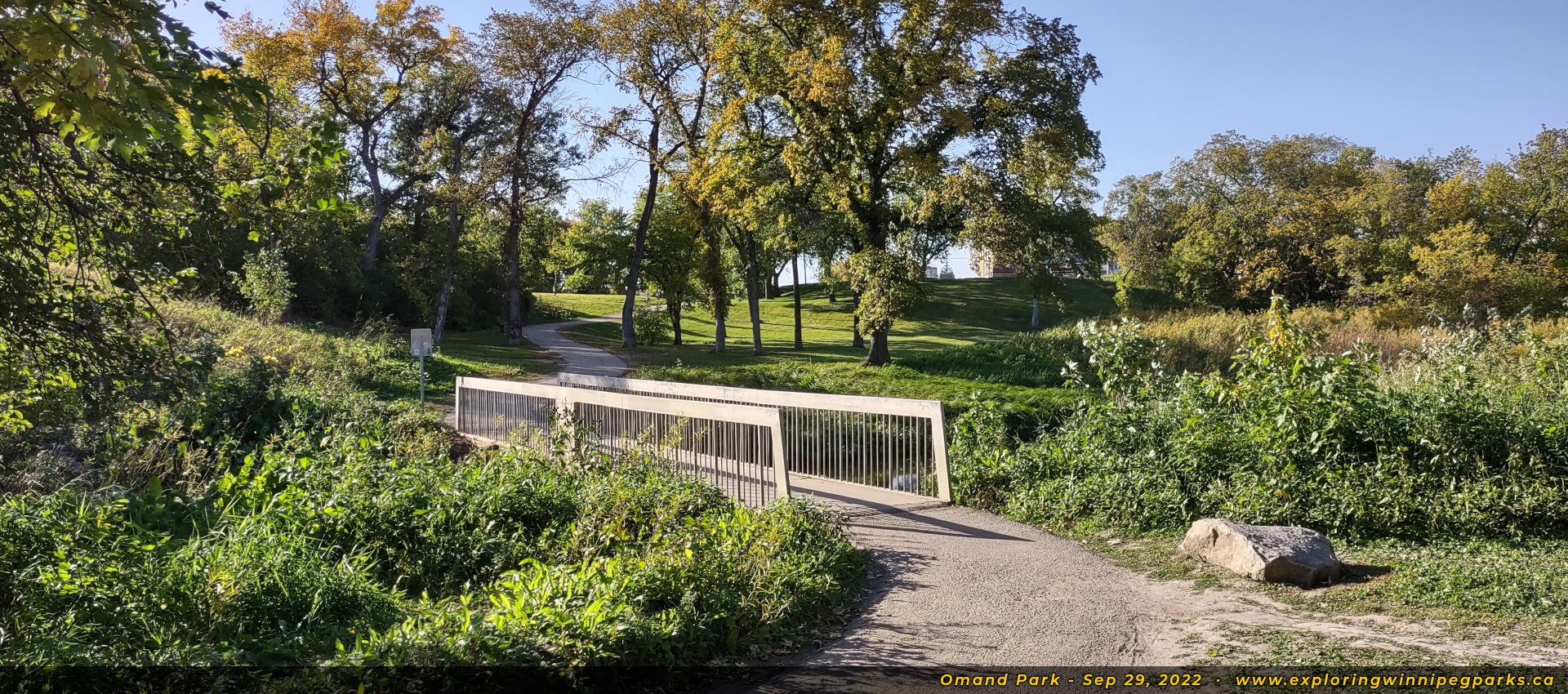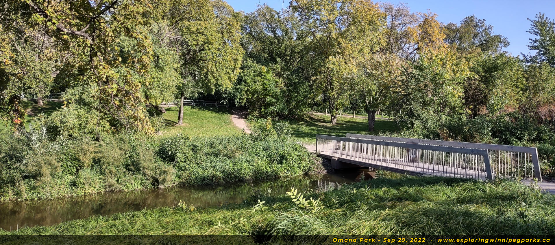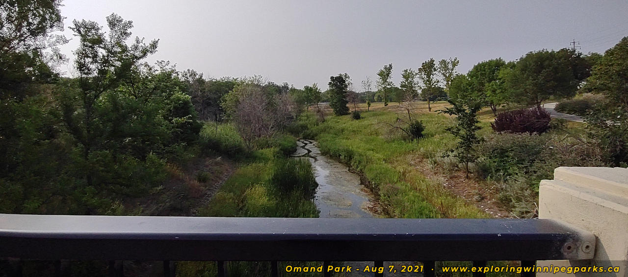 Pathways converge near the southeast corner of the park to a footbridge over Omand's Creek, facing south.