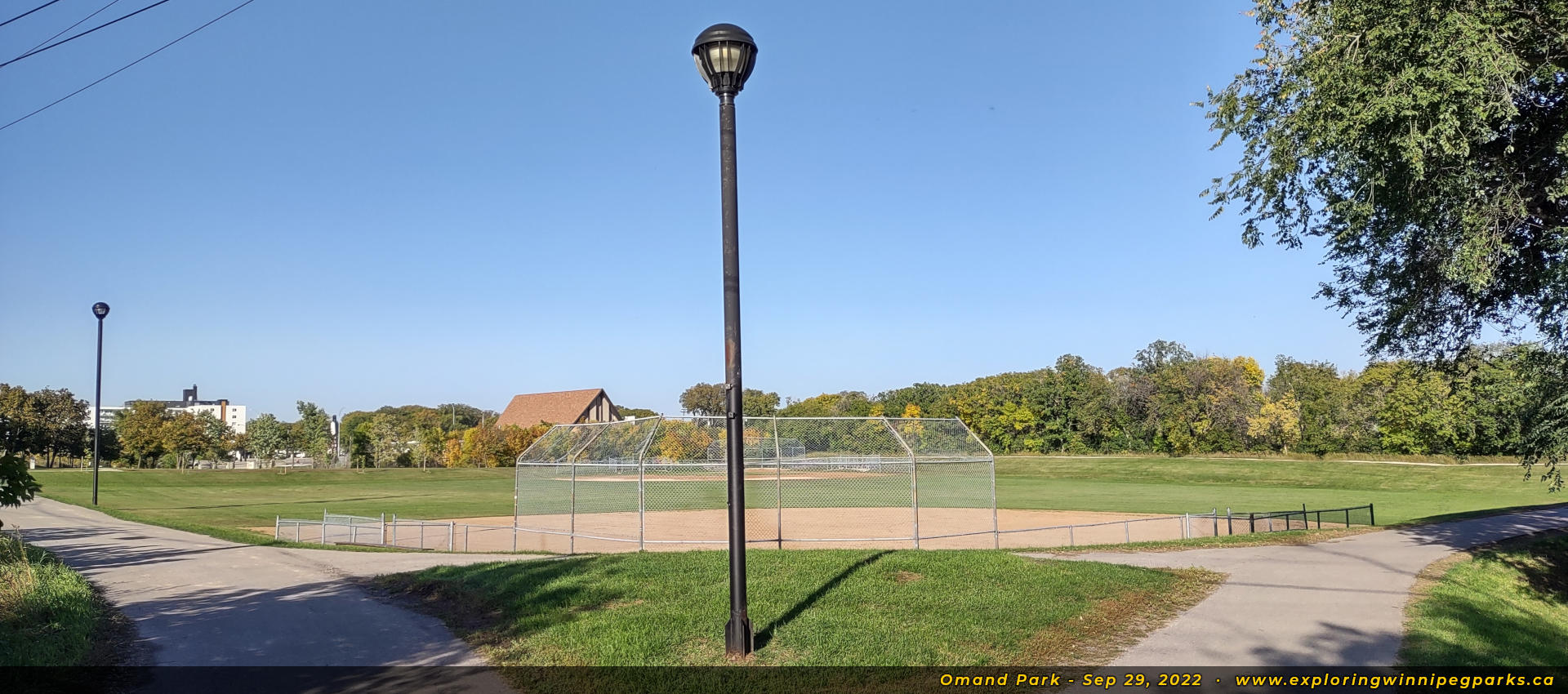The pathway coming off the Assiniboine River footbridge splits around the baseball diamonds. Facing northeast.