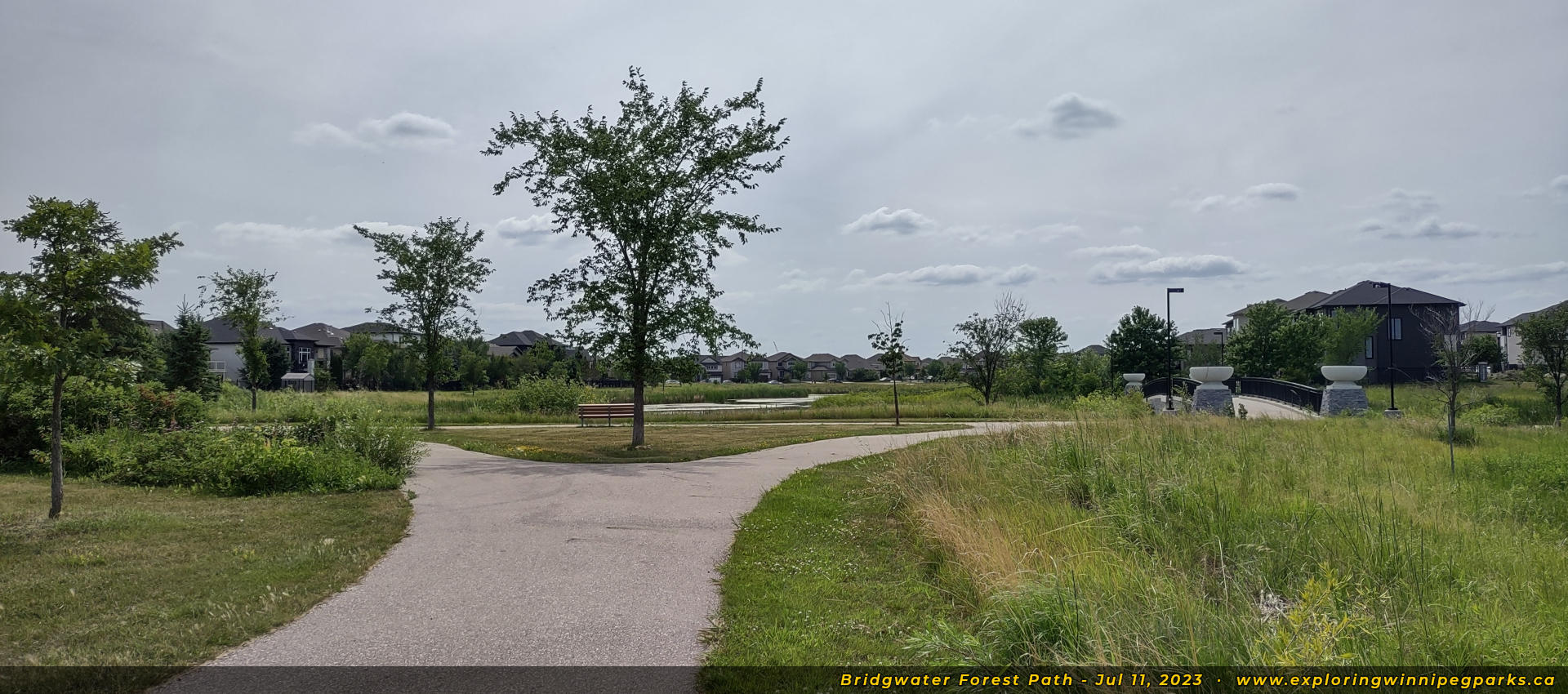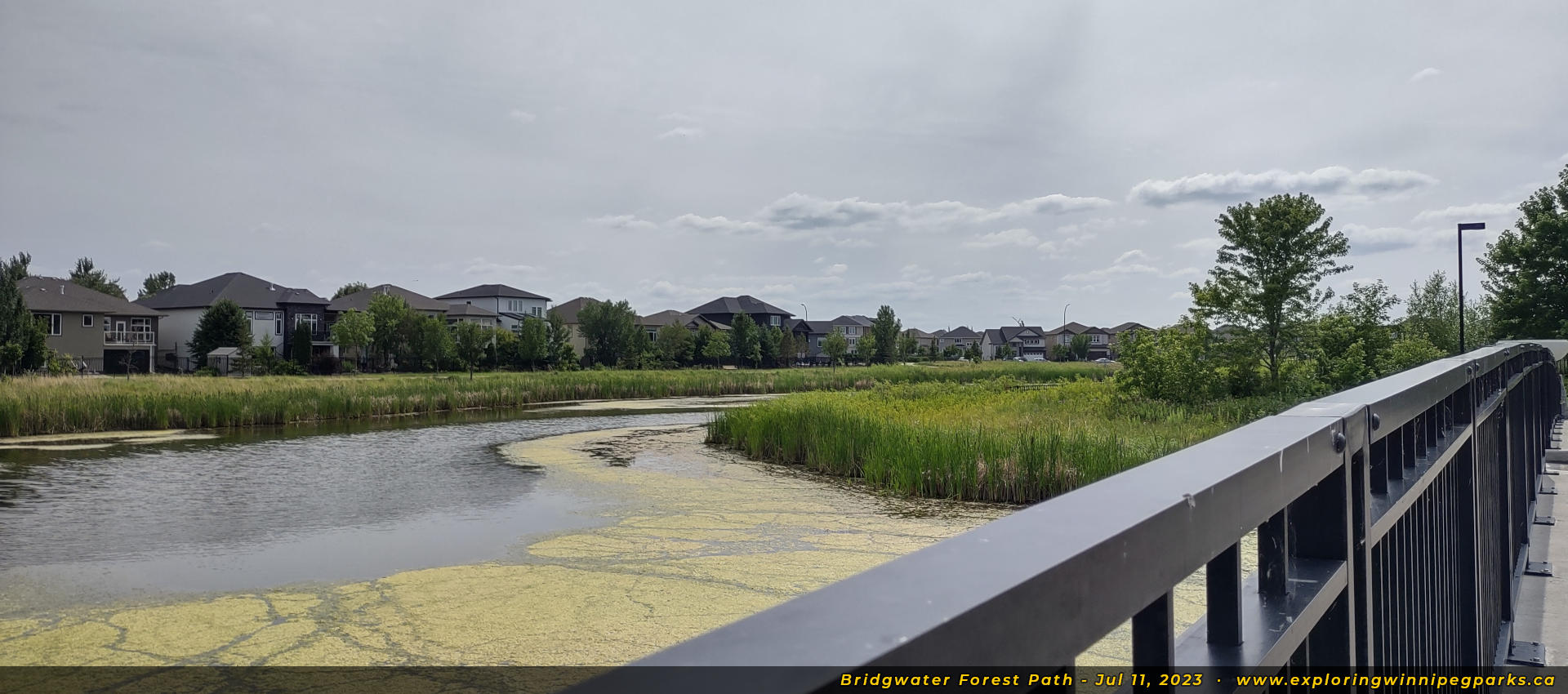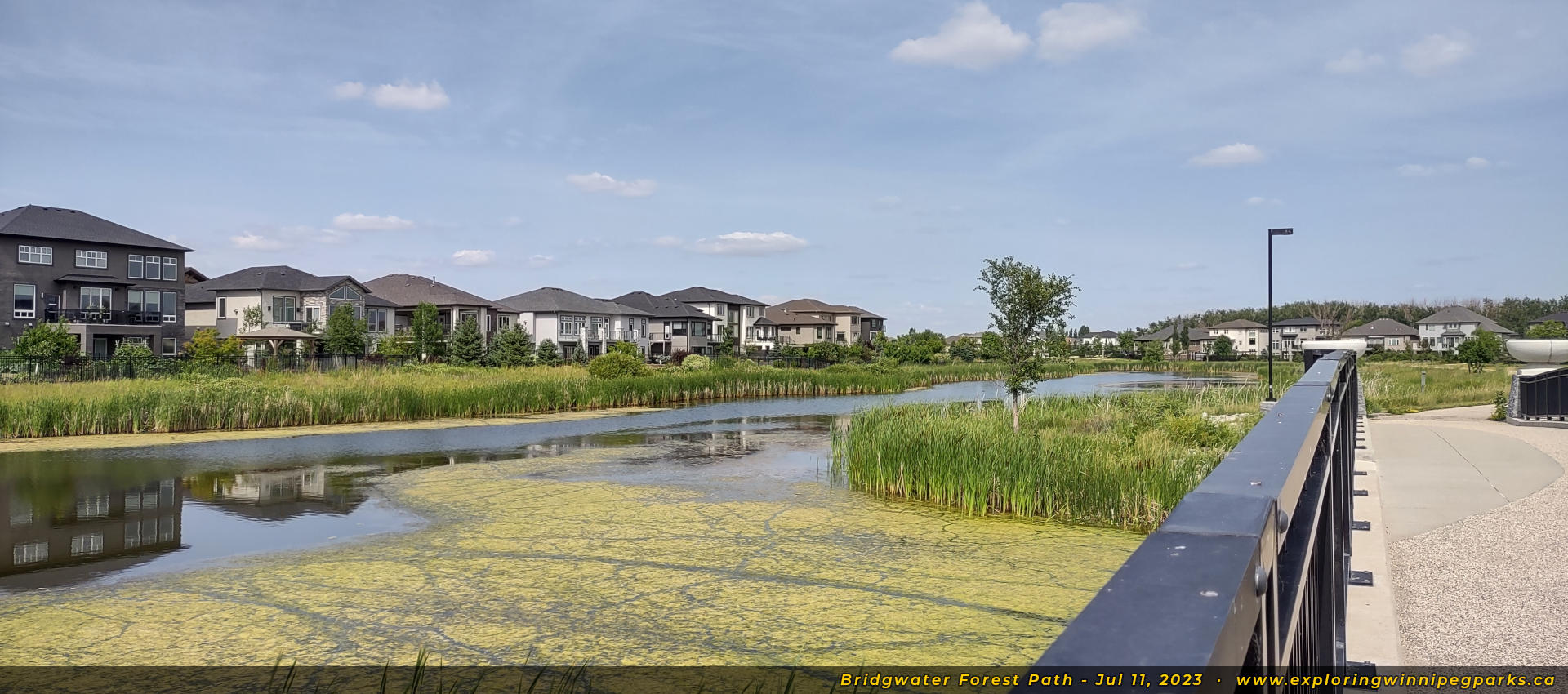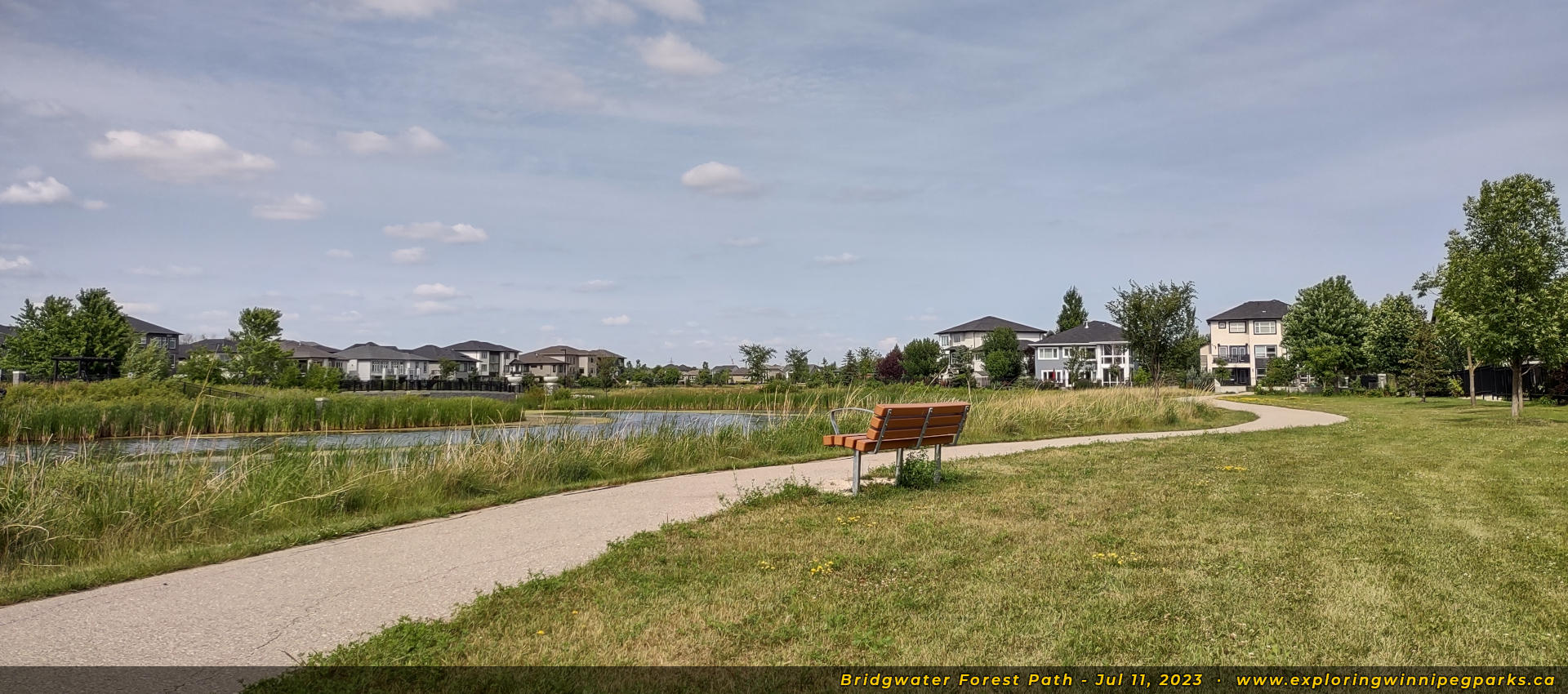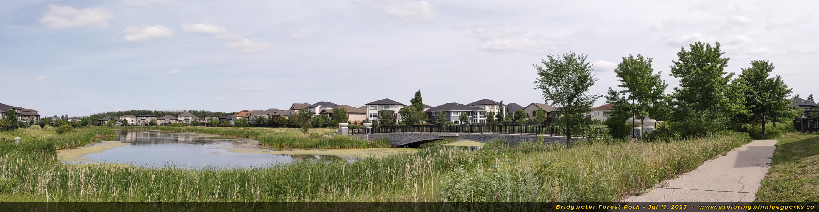 Bridgwater Forest Path is located in the center of the Bridgwater Forest neighbourhood, sandwiched between Highland Creek Rd and Maple Creek Rd. A long pathway runs alongside a pond through the park, with a footbridge in the center.