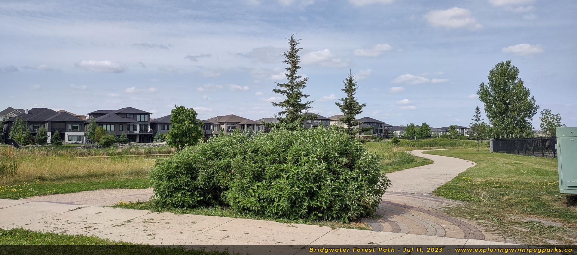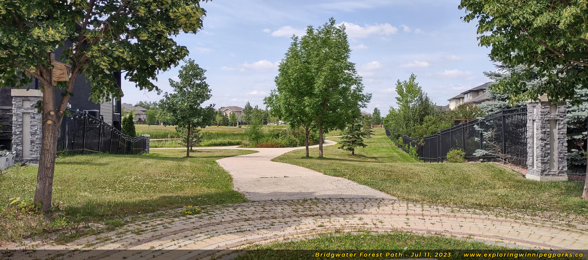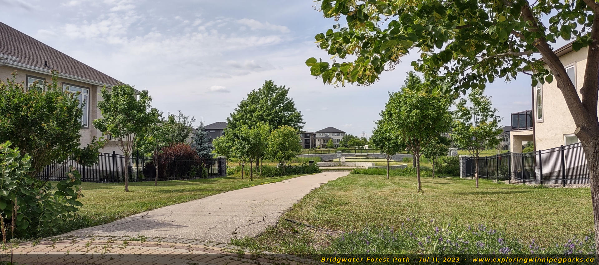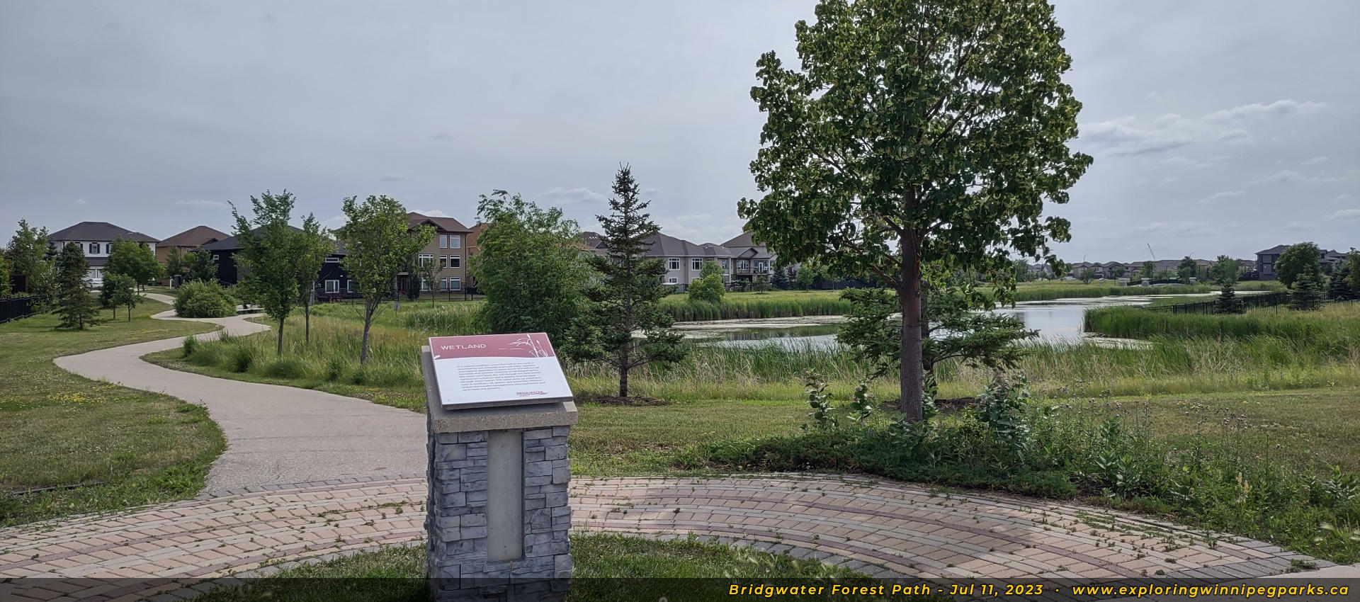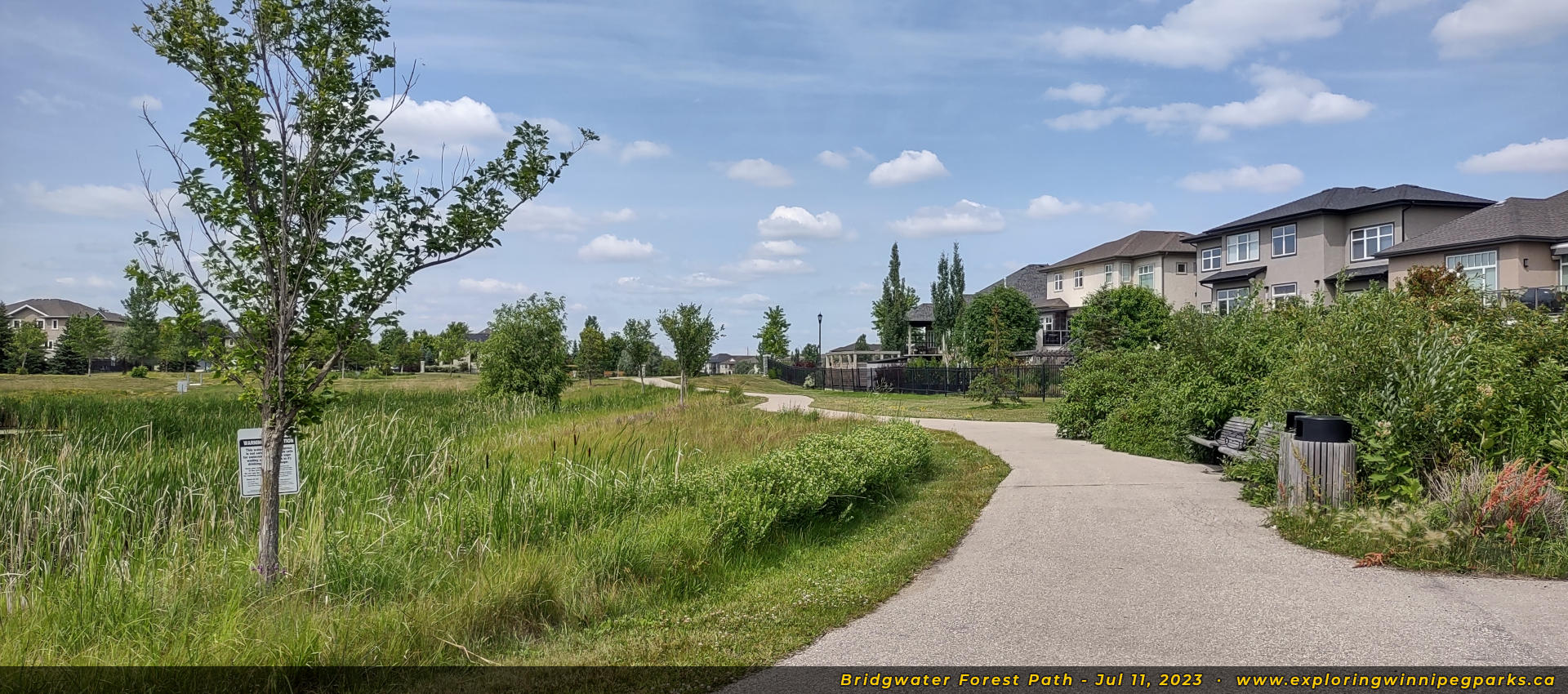 Bridgwater Forest Path is located in the center of the Bridgwater Forest neighbourhood, sandwiched between Highland Creek Rd and Maple Creek Rd. A long pathway runs alongside a pond through the park, with a footbridge in the center.