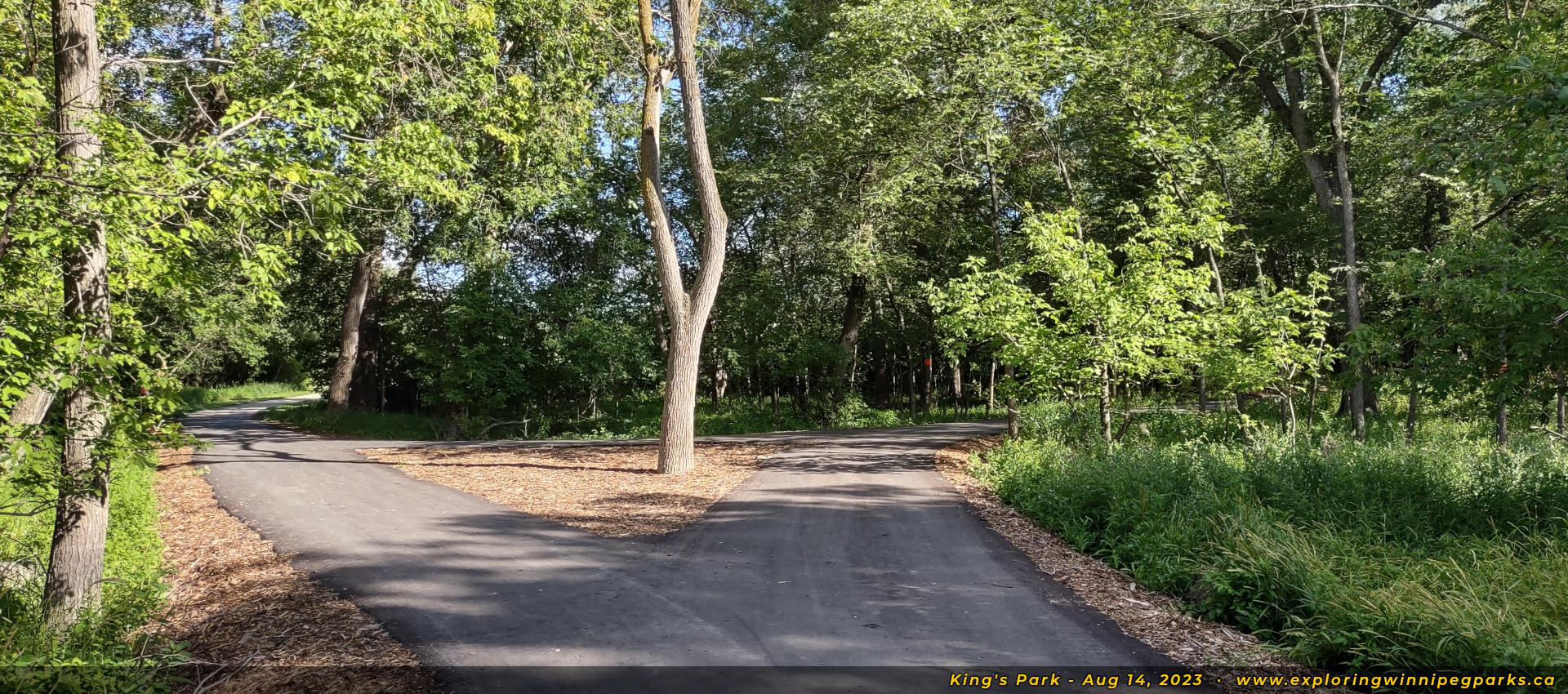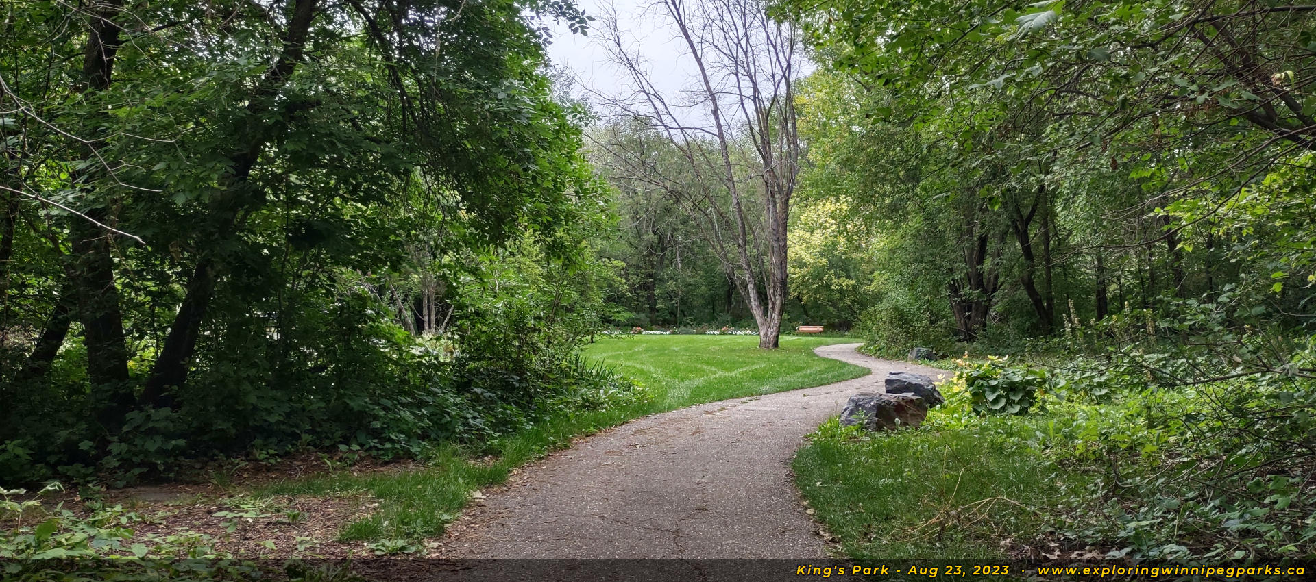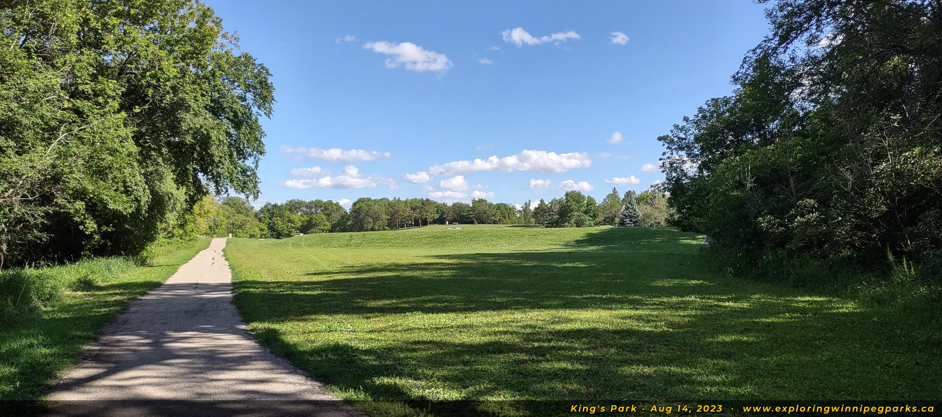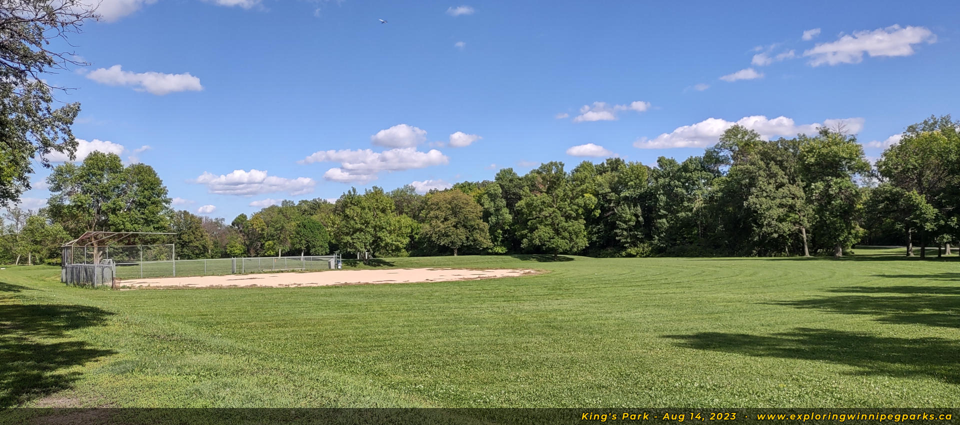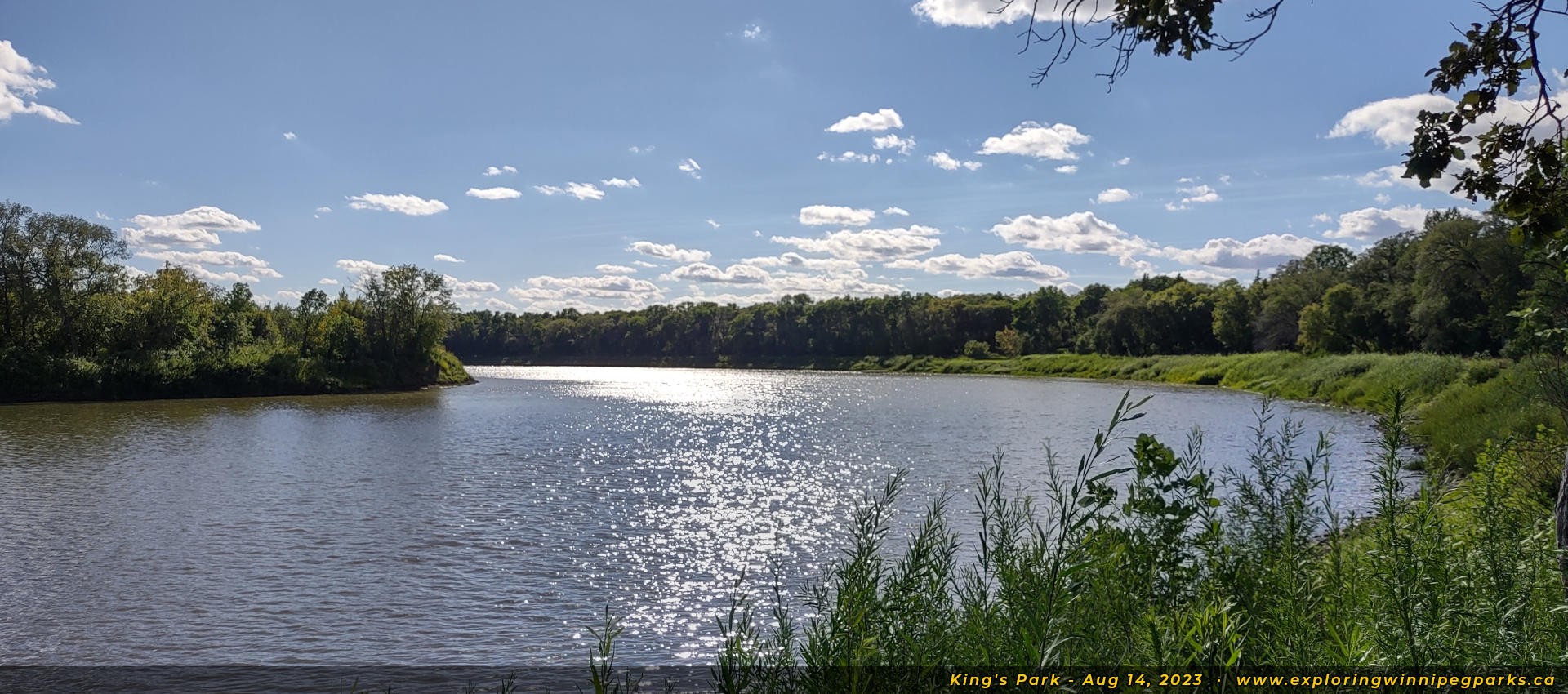 King's Park is located on an expansive peninsula surrounded by the Red River, accessible on the east side of King's Dr near Kilkenny Dr. There's a soccer field and baseball diamond near the entrance, with pathways leading around the edges of the park. Several scenic outlooks are scattered amongst the park's attractions, along with a large off-leash dog area and toboggan run.