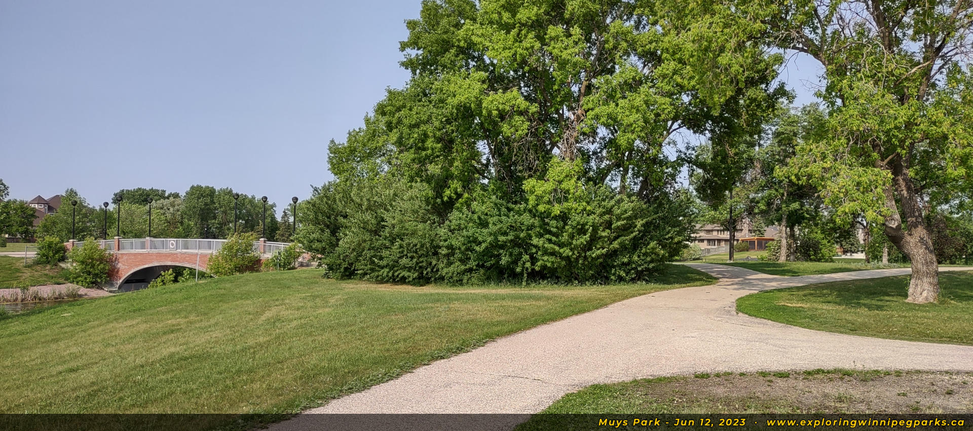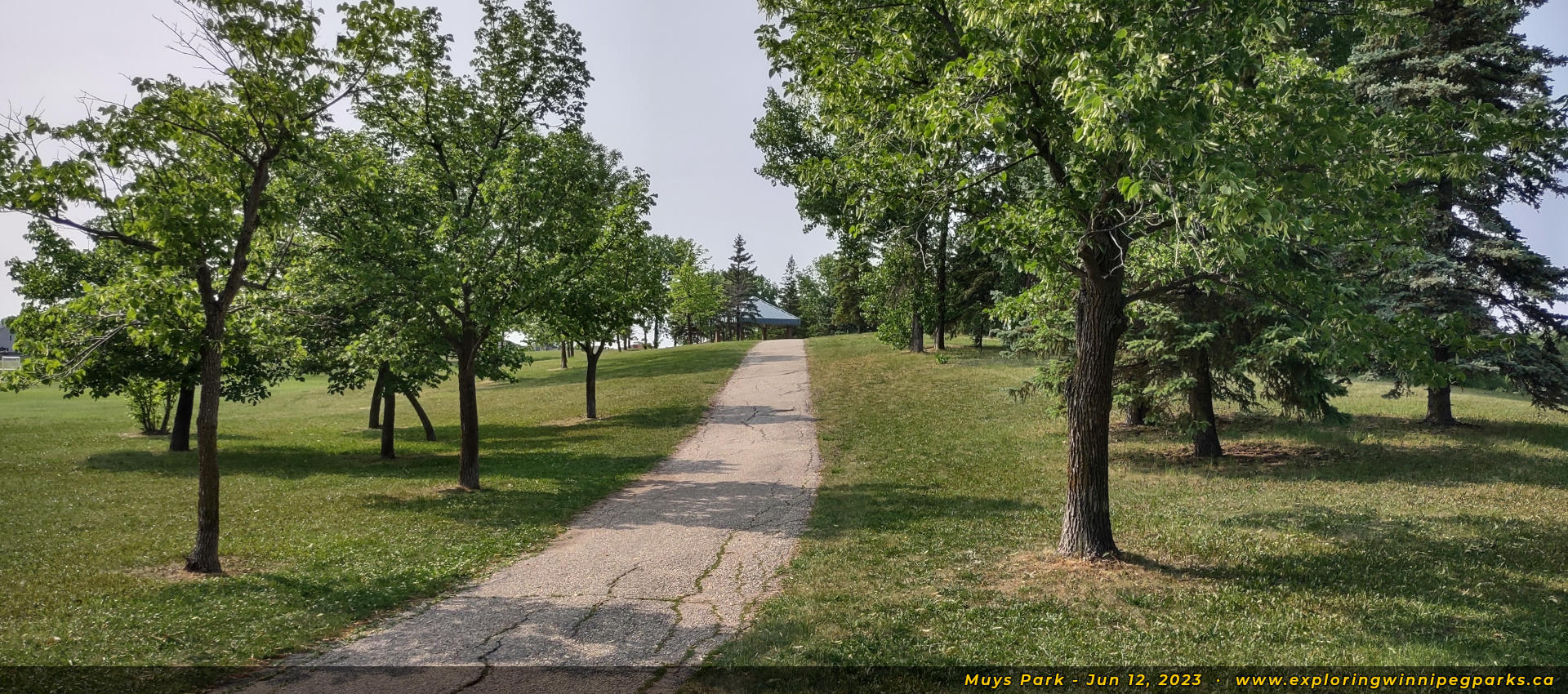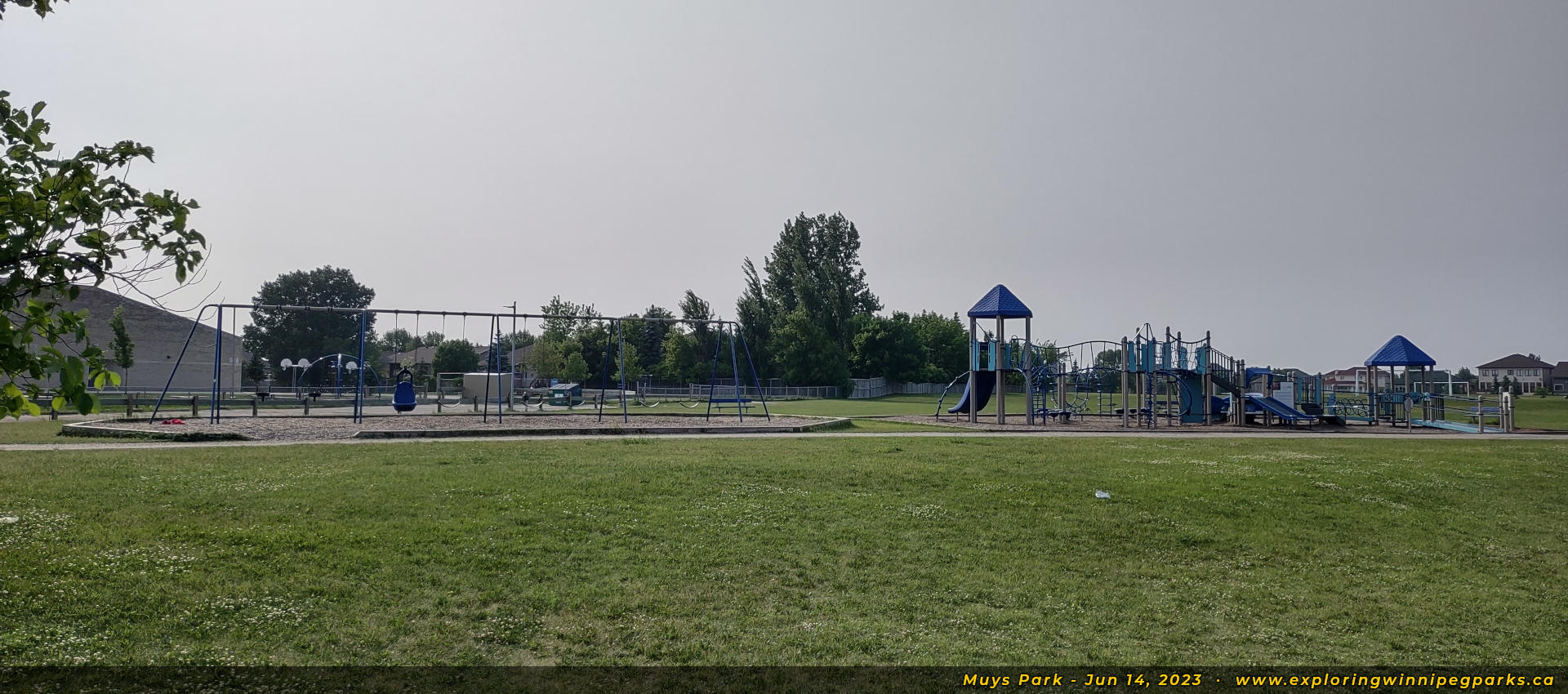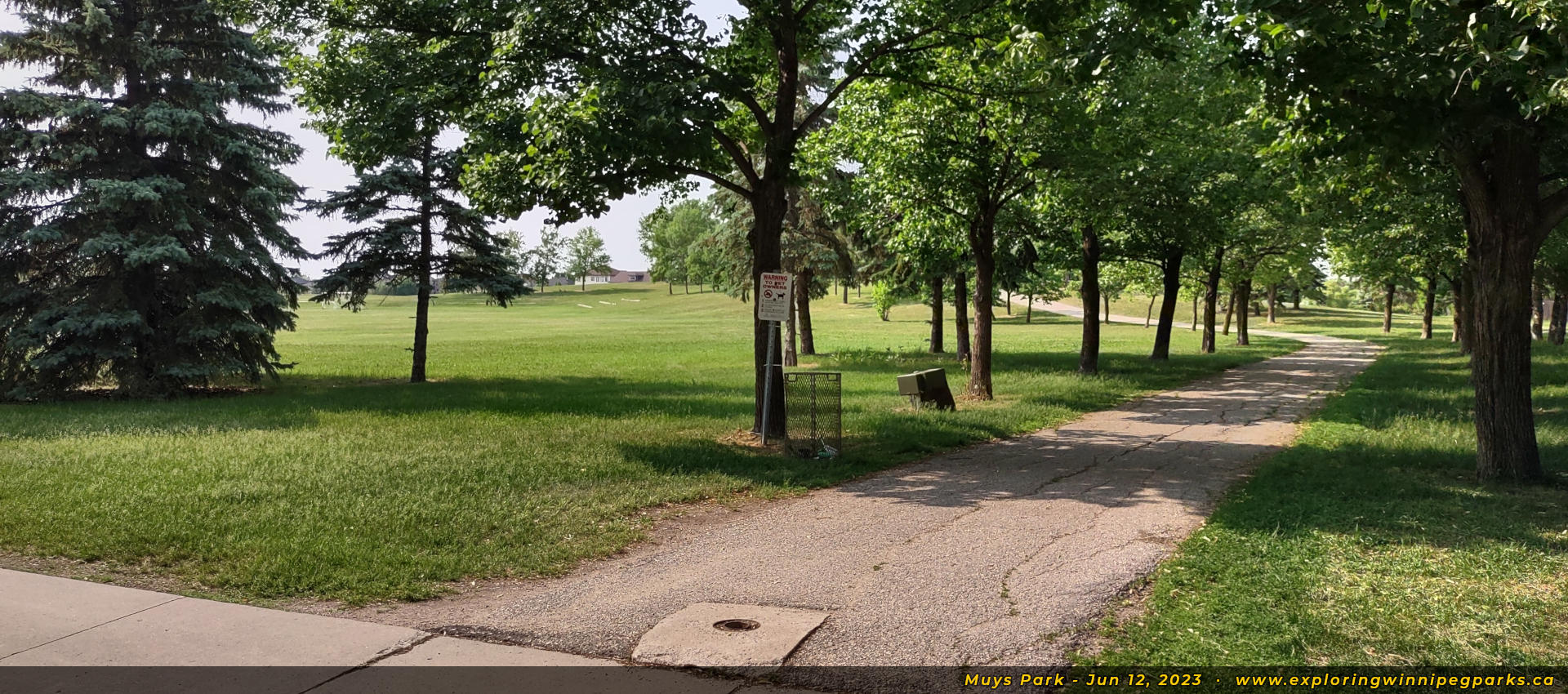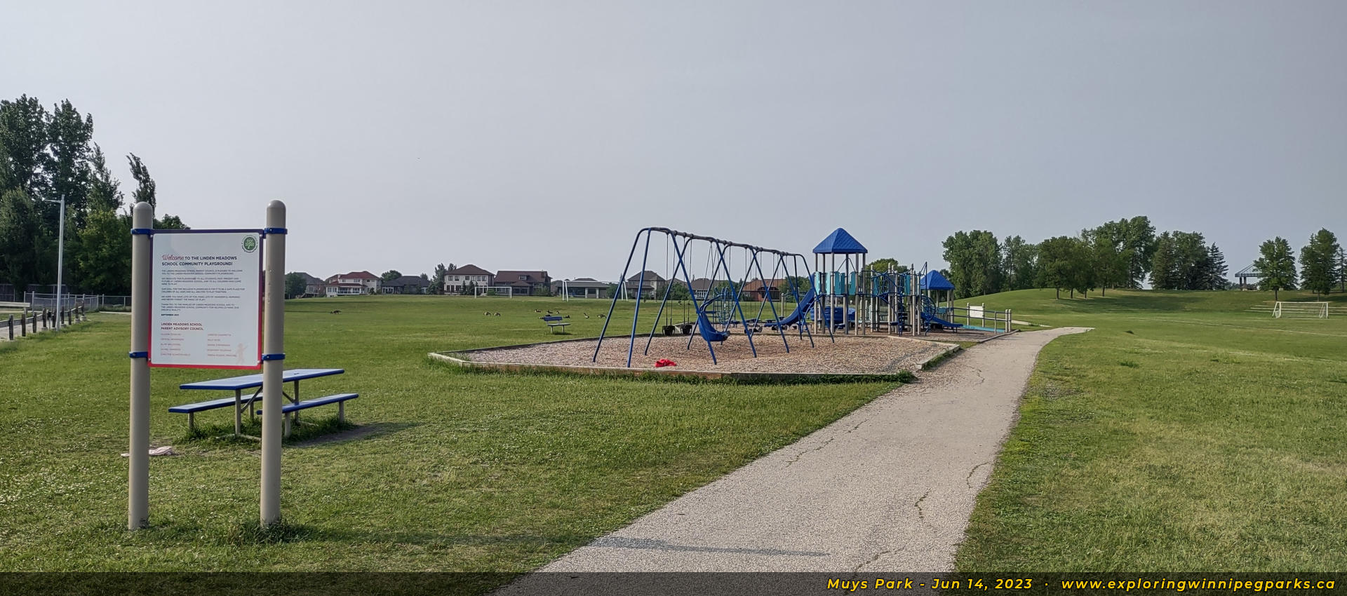 Welcome to Muys Park! The pathway entering the park from the southwest corner off Lindenwood Dr E makes its way past a playground. Facing north.