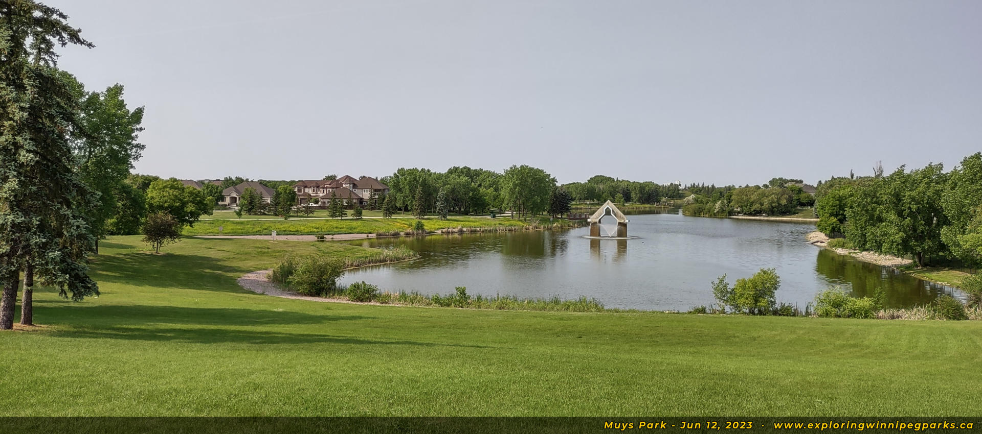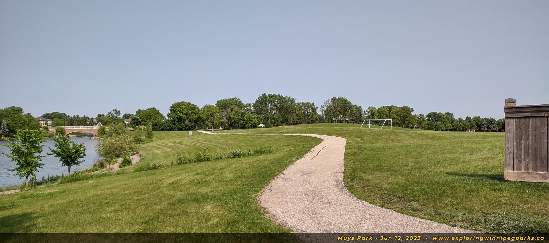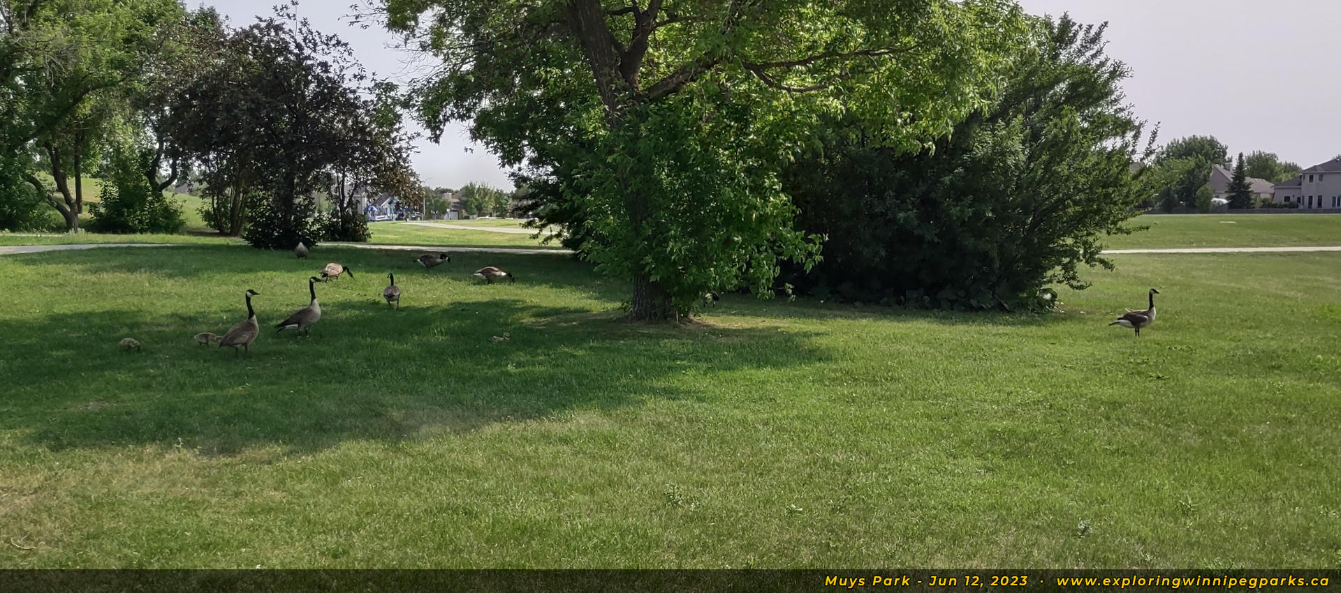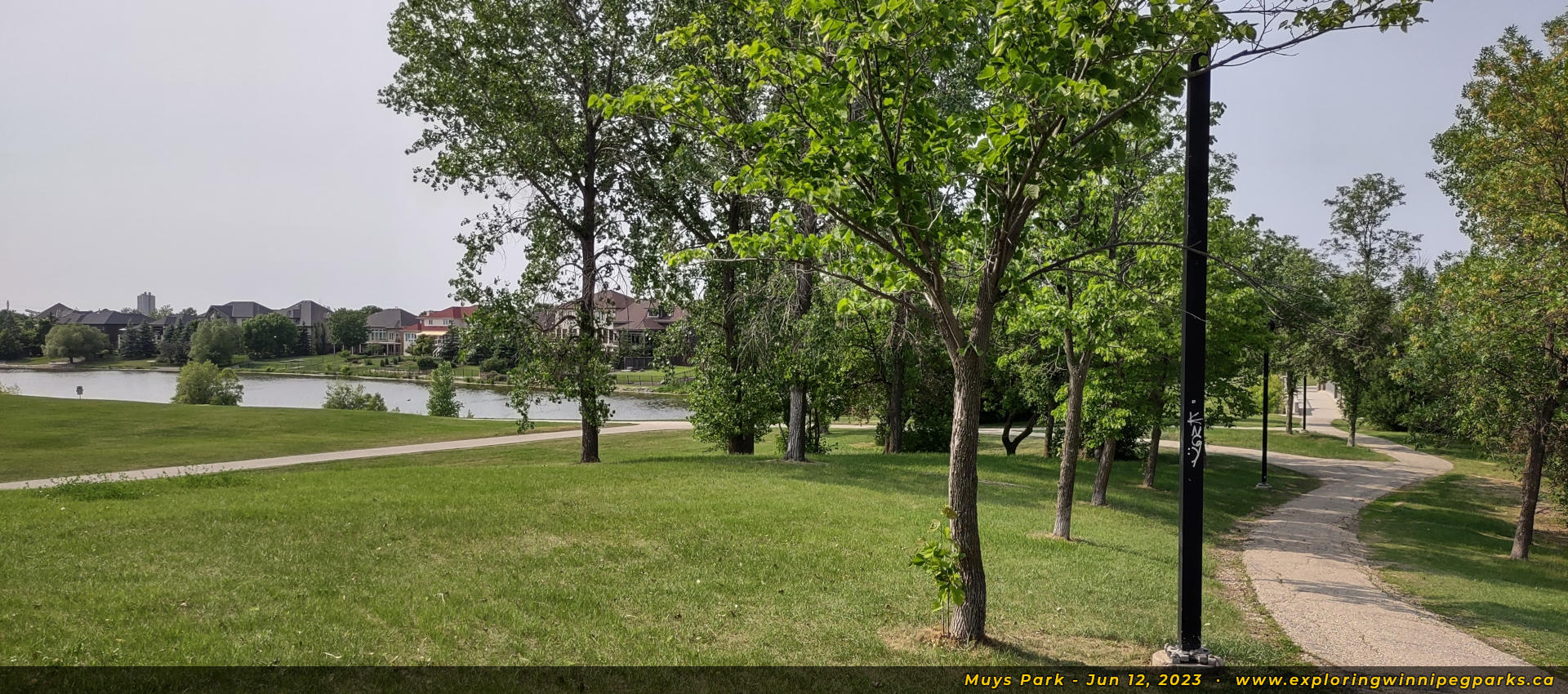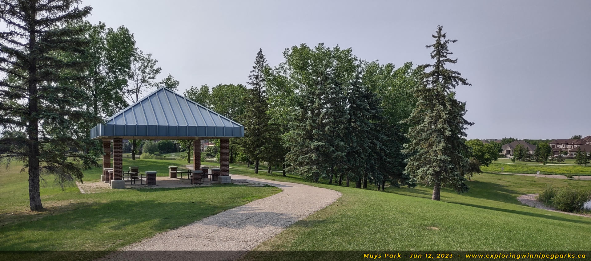 Welcome to Muys Park! The pathway entering the park from the southwest corner off Lindenwood Dr E makes its way past a playground. Facing north.