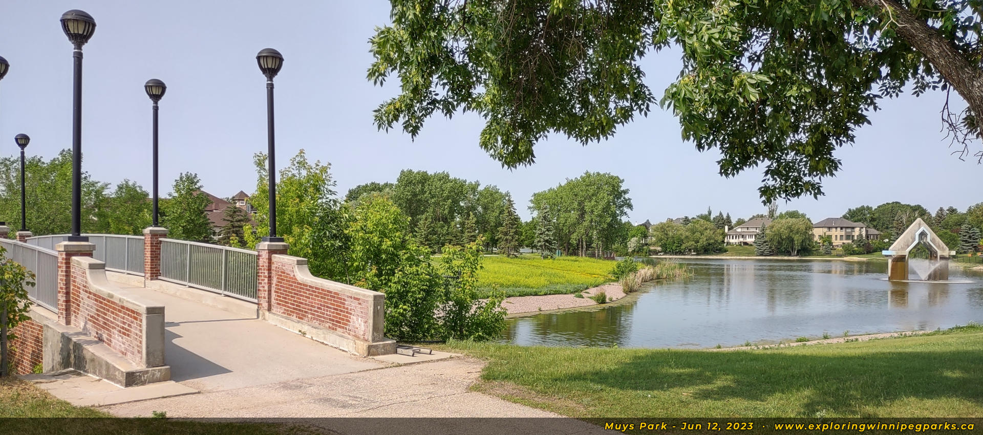 A footbridge crosses over the pond into Lindenwoods Park in the northeast corner, facing northeast.