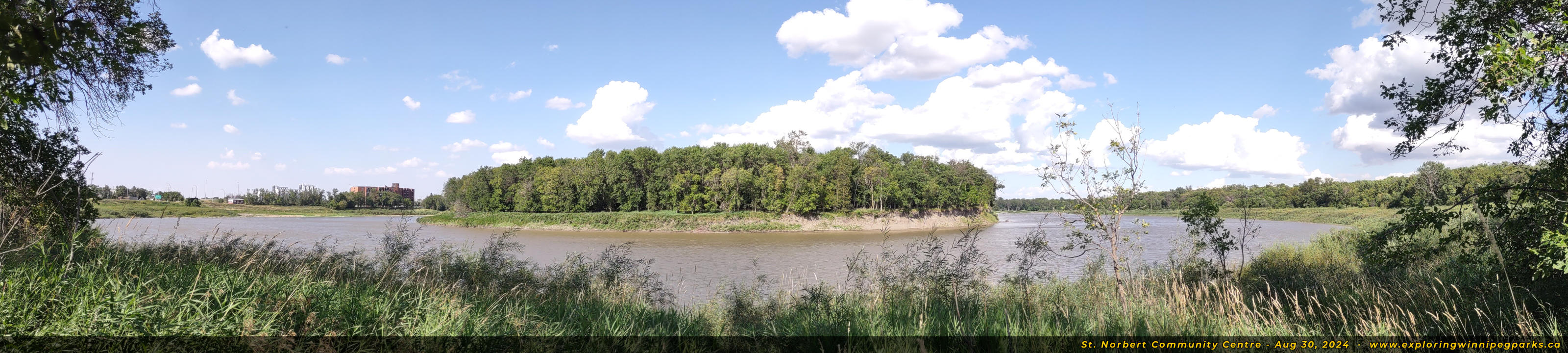 Wide angle view of the Red River from the northeast corner of the park area, as it winds its way around a peninsula in the South St. Vital area. Facing northeast.