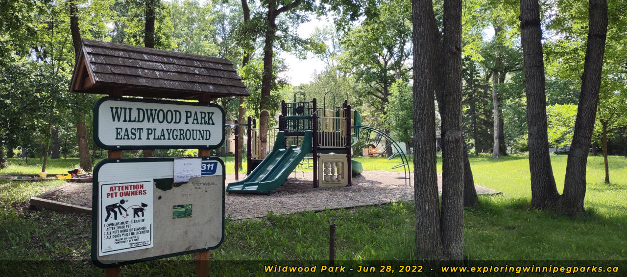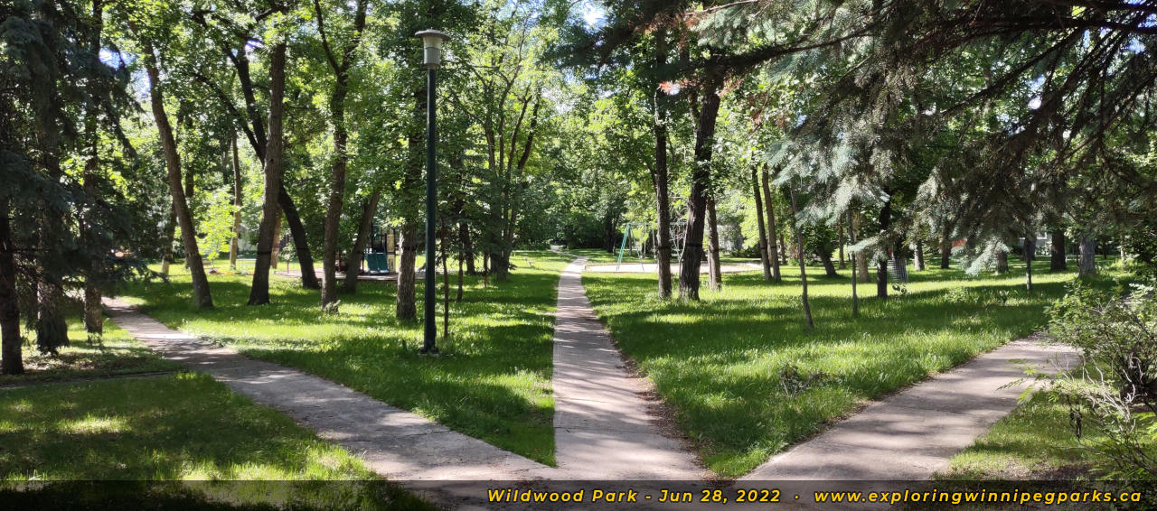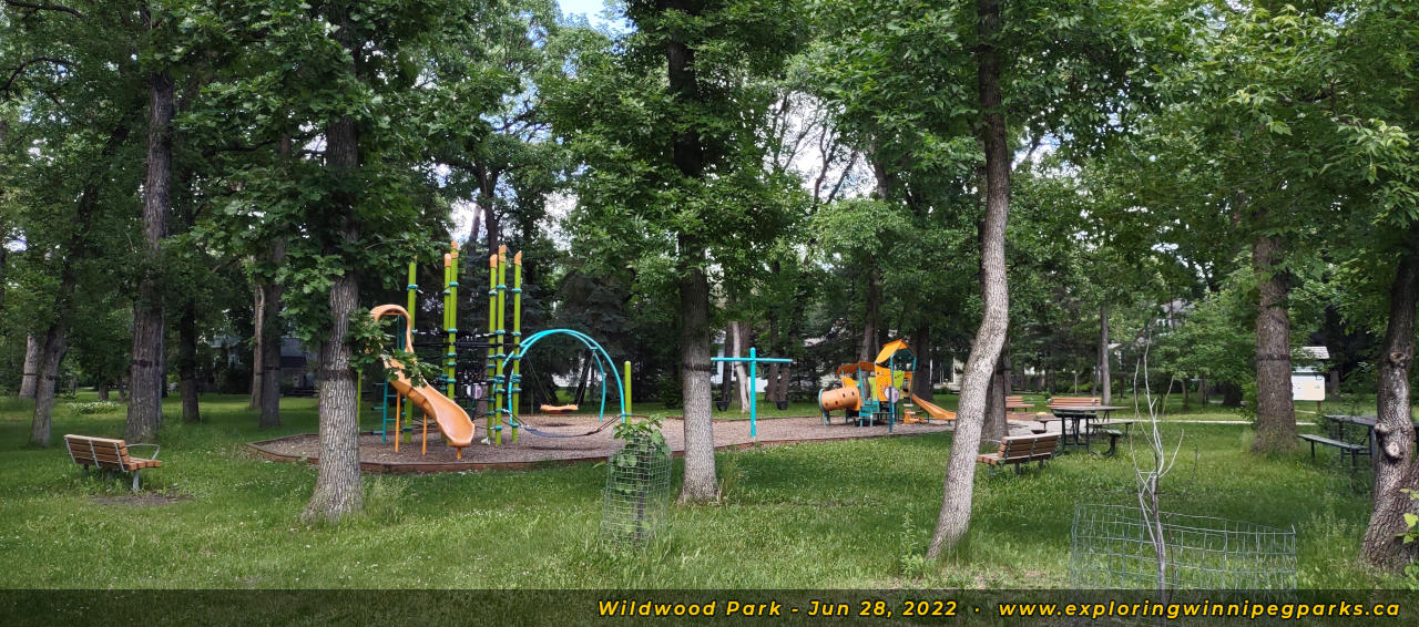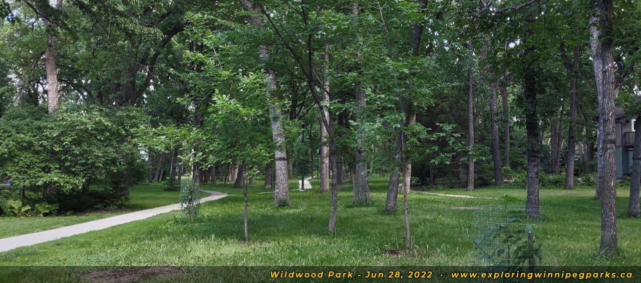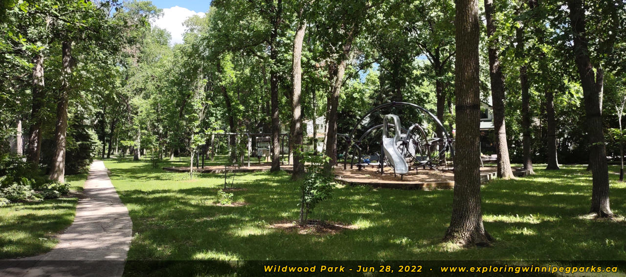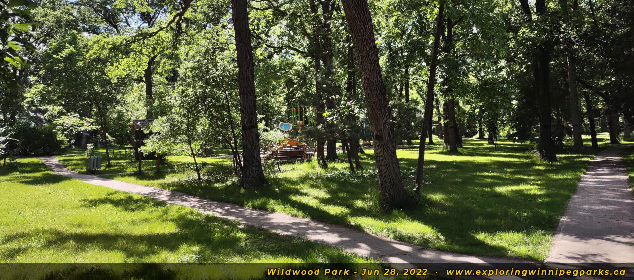 Wildwood Park weaves through the tree canopy behind the many bays to the southeast of Oakenwald Ave and Wildwood St. There are many pathways and entrances, with three separate playgrounds.