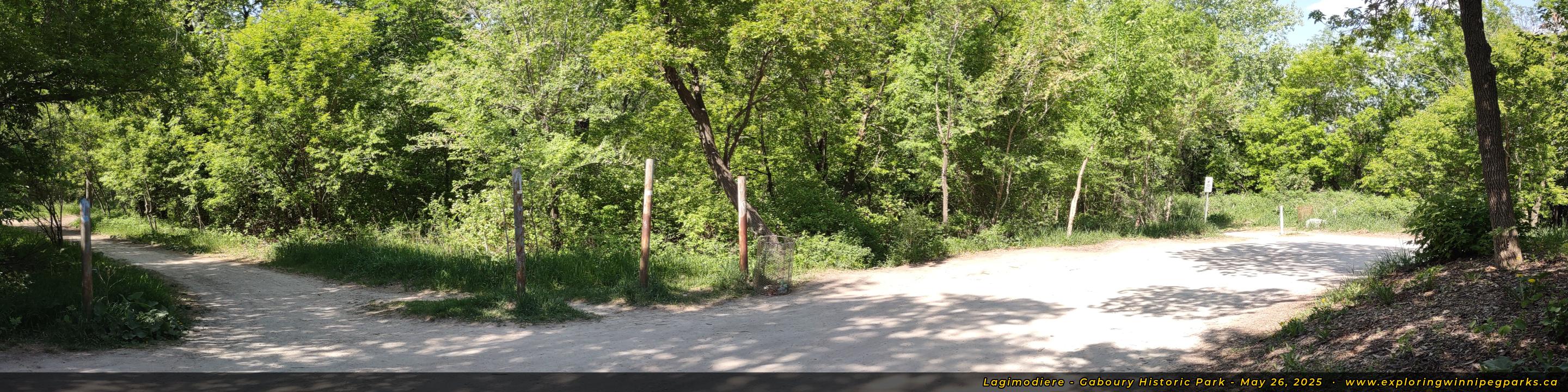 Just east of the parking loop, the pathways leading into the park diverge. The left biking trail leads towards a soccer field, while the right pathway runs along the Seine River.