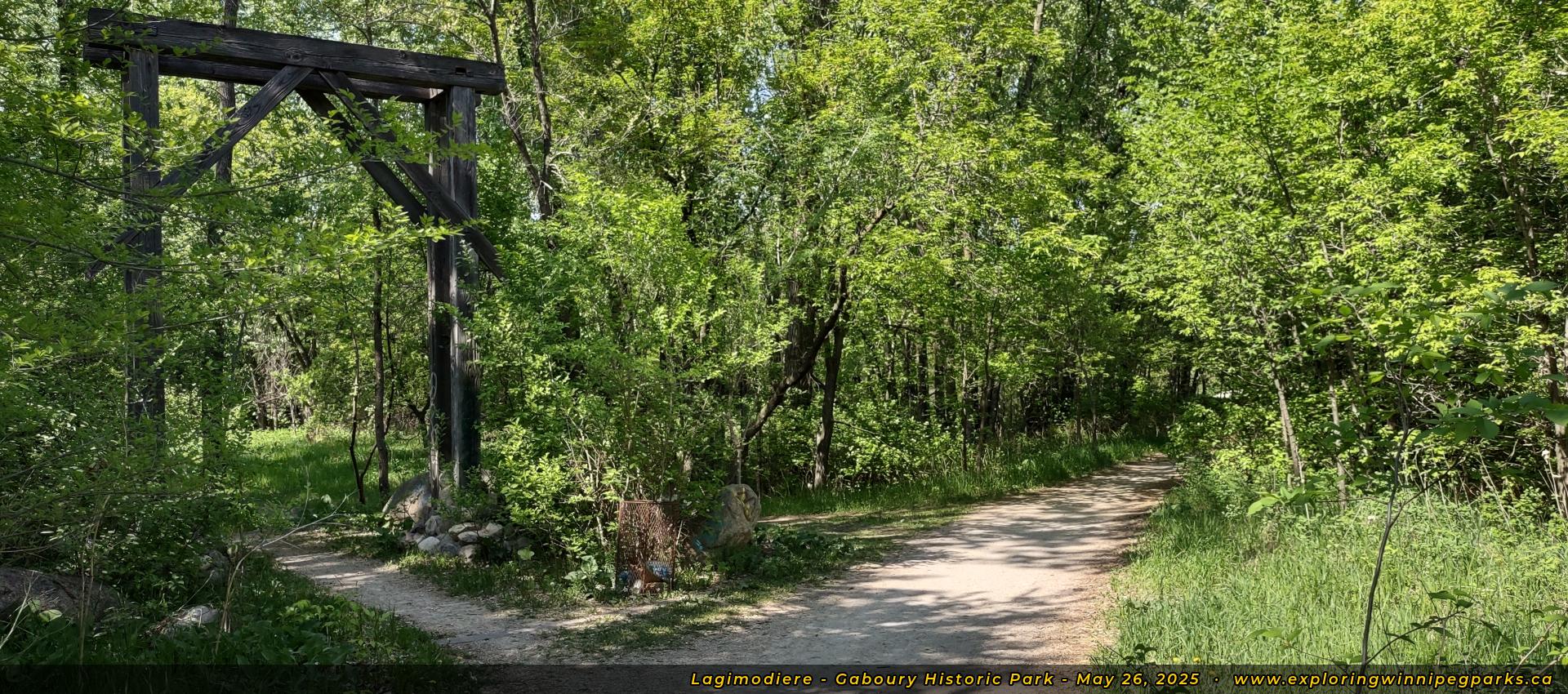 A little further in, a wooden arch adorns another trail that diverges from the main pathway. Facing north.