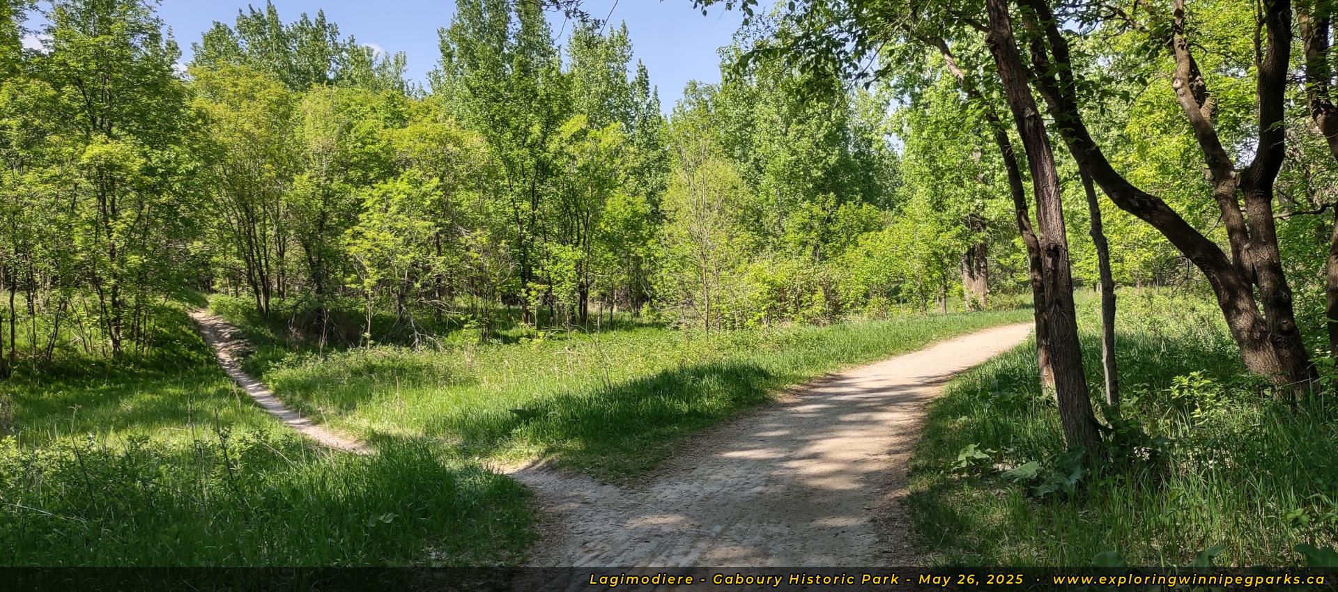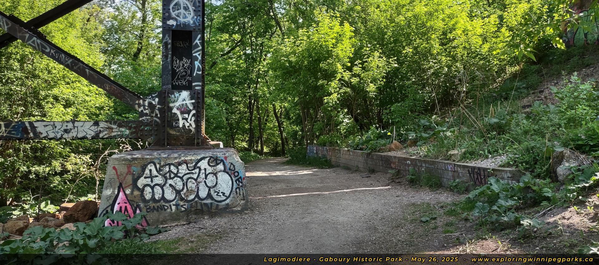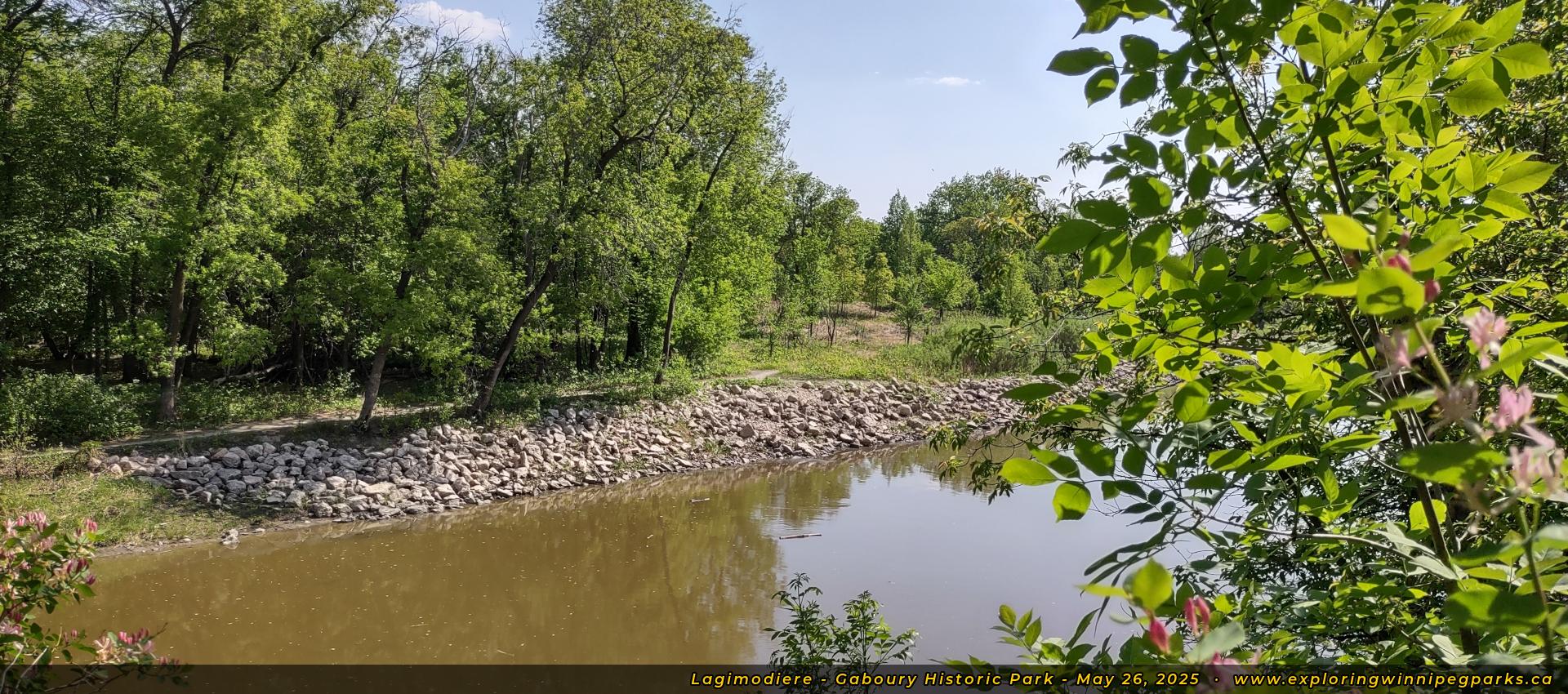 Near the northeast corner of the park, a dirt trail leads down to the bank Seine River as it flows north under the rail tracks into the Red River.