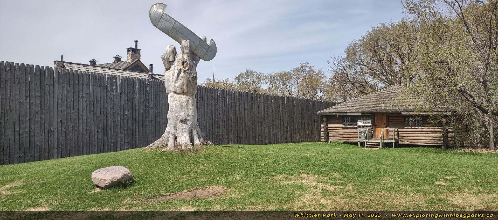 A tall wood carving of a hand holding a canoe evokes the story of La-Chasse-galerie, in front of the Maison Chaboillez bridal venue. Facing northwest.