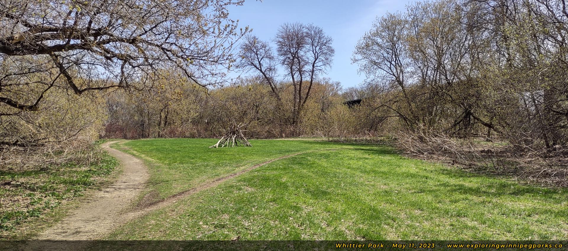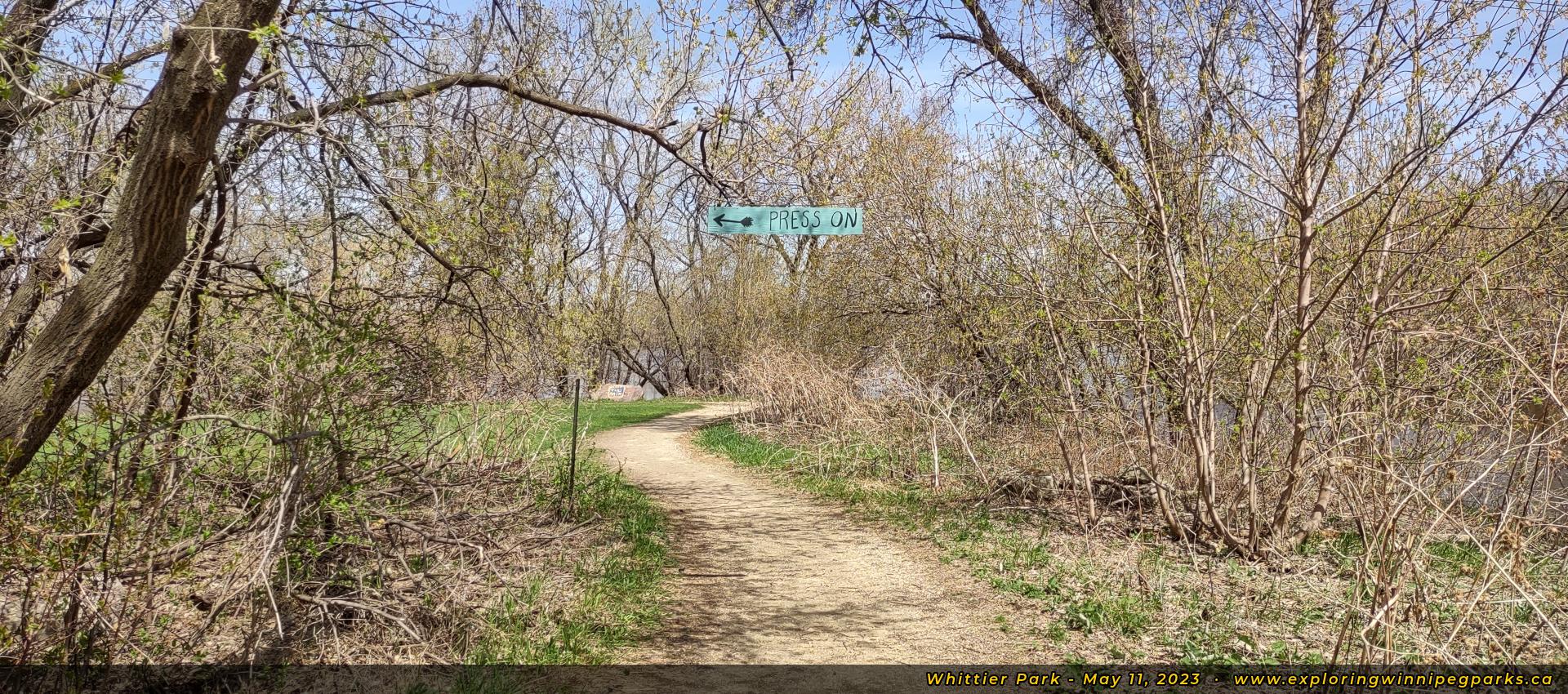 The trail from Lagimodiere - Gaboury Historic Park heads under the railroad bridge into Whittier Park. Facing north.