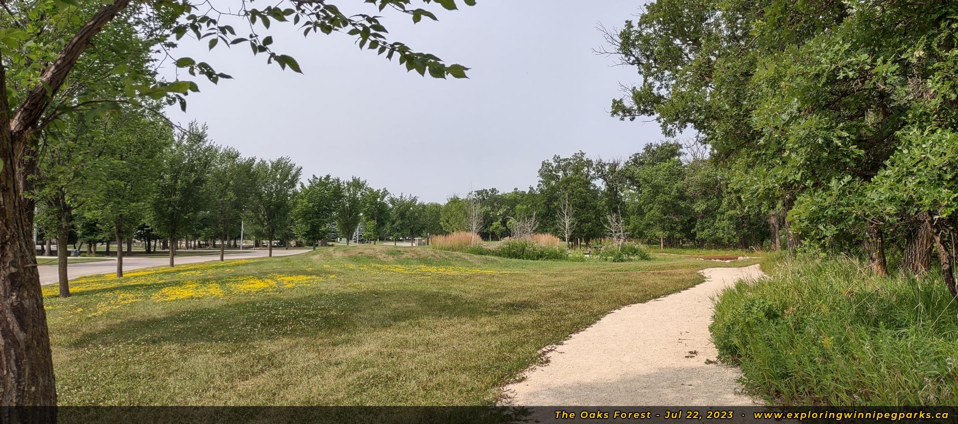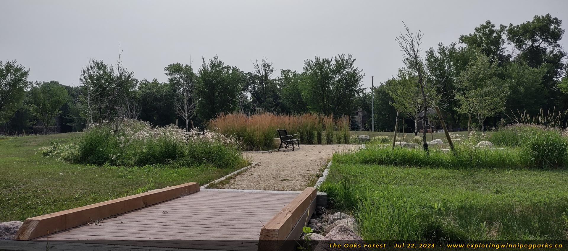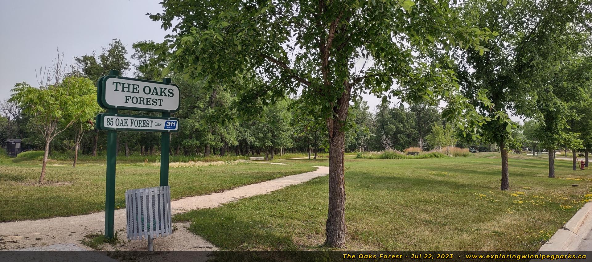 The Oaks Forest is found to the north and west of Oak Forest Cres, to the west of the intersection with Grand Oaks Cres. There's a pathway winding through the park near a forested area, with a nature playground and monument.
