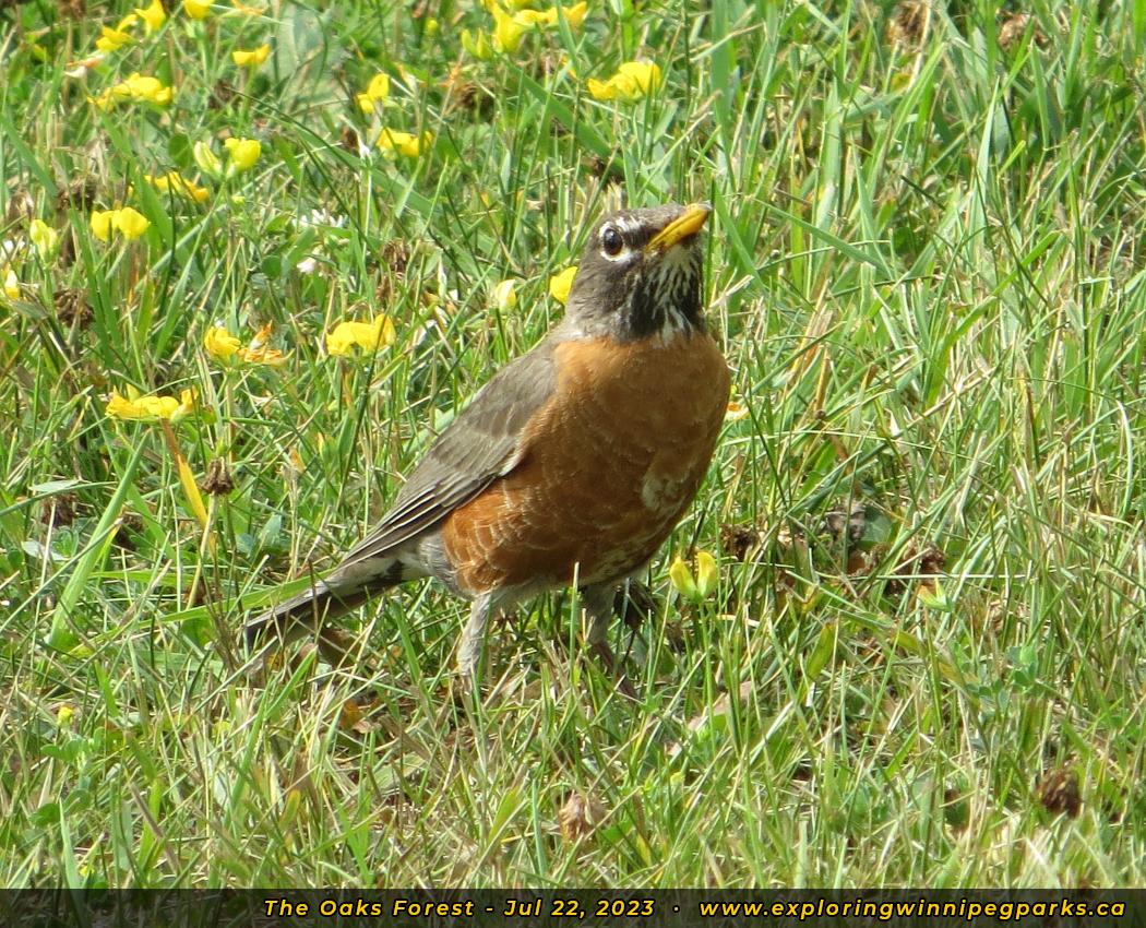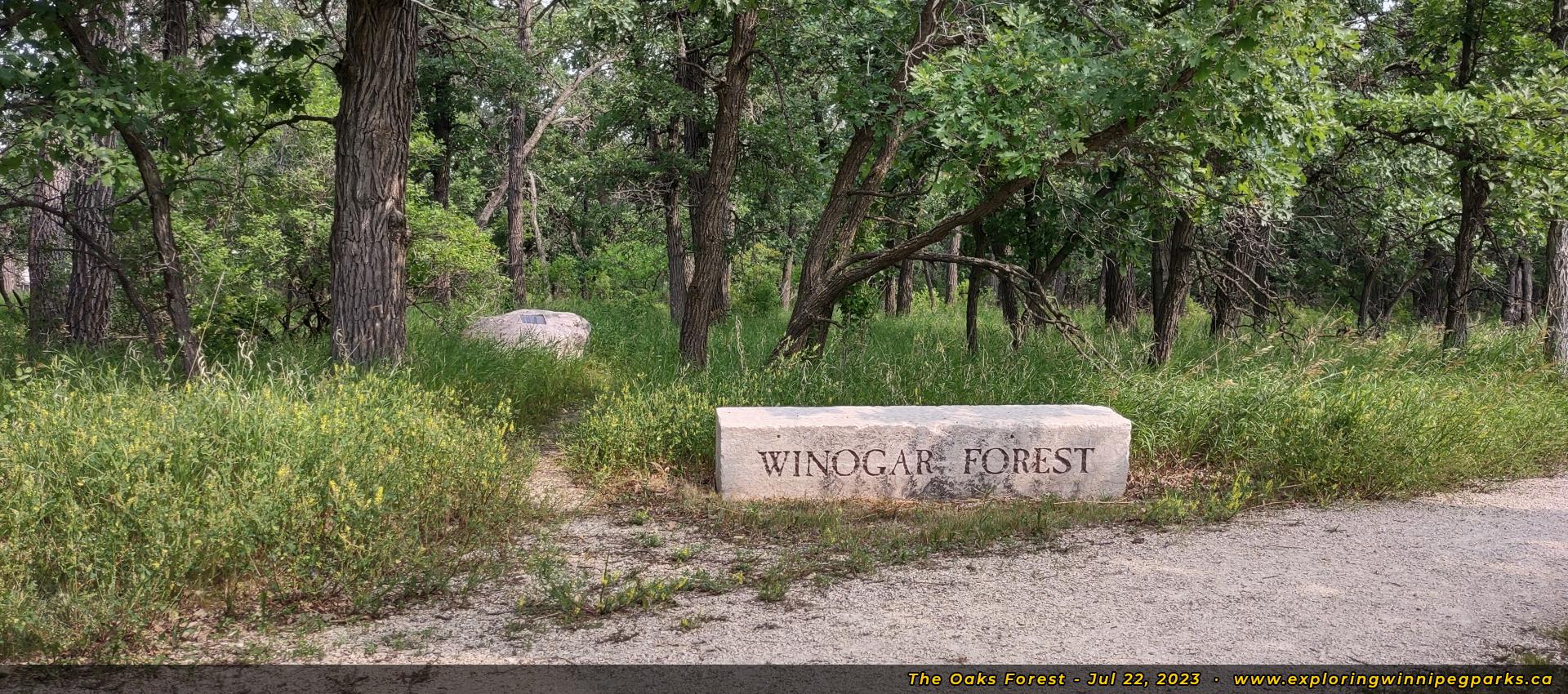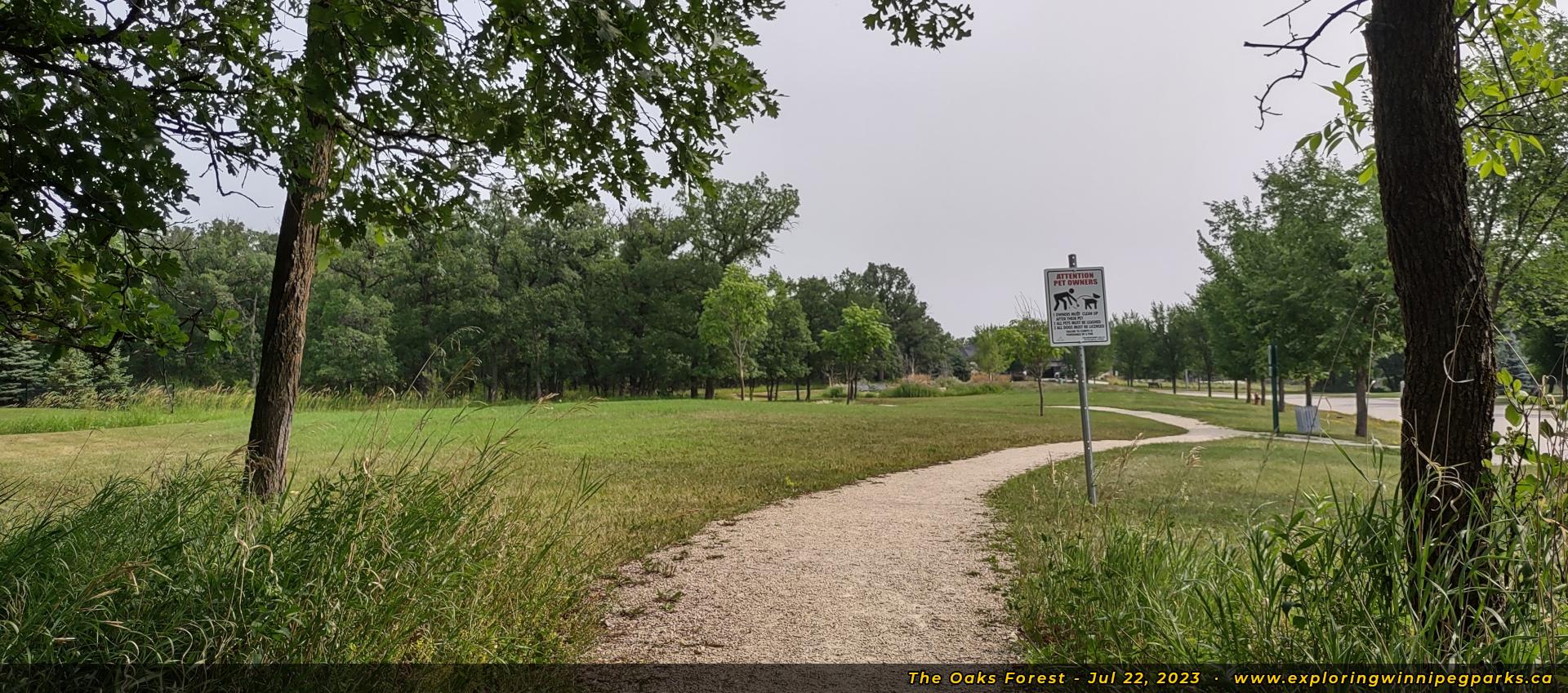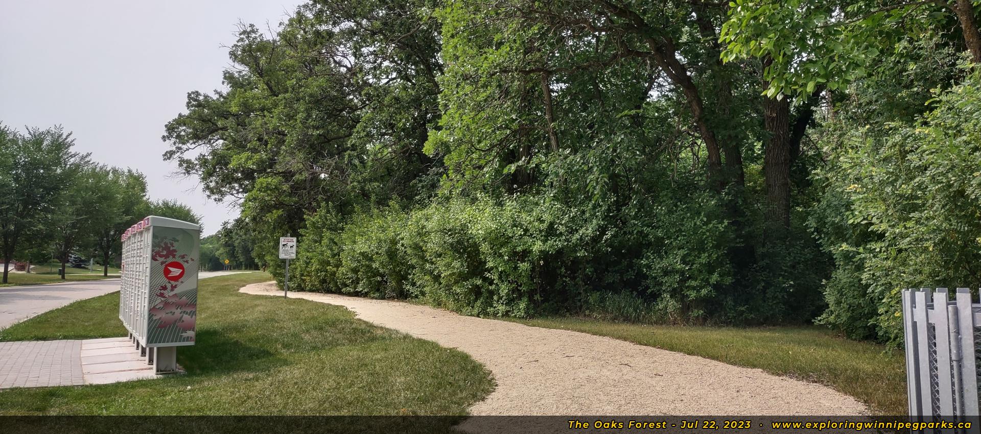 The Oaks Forest is found to the north and west of Oak Forest Cres, to the west of the intersection with Grand Oaks Cres. There's a pathway winding through the park near a forested area, with a nature playground and monument.