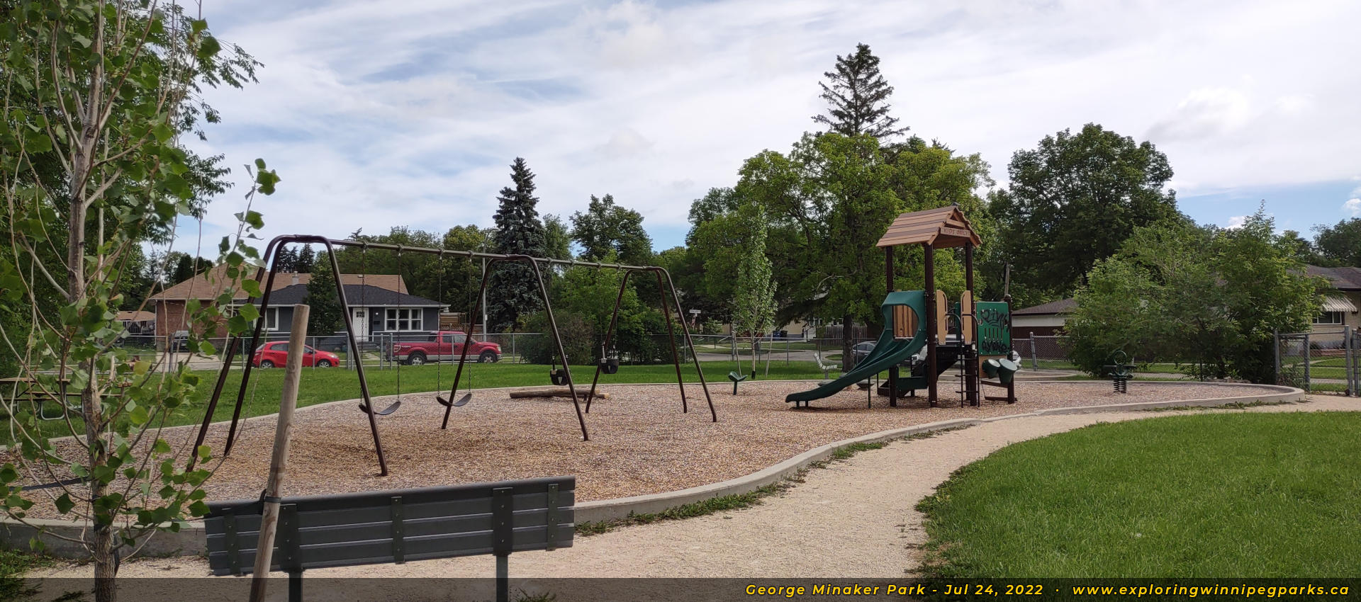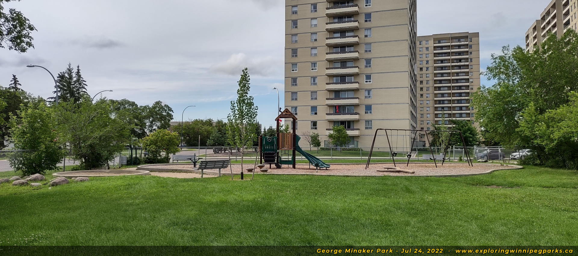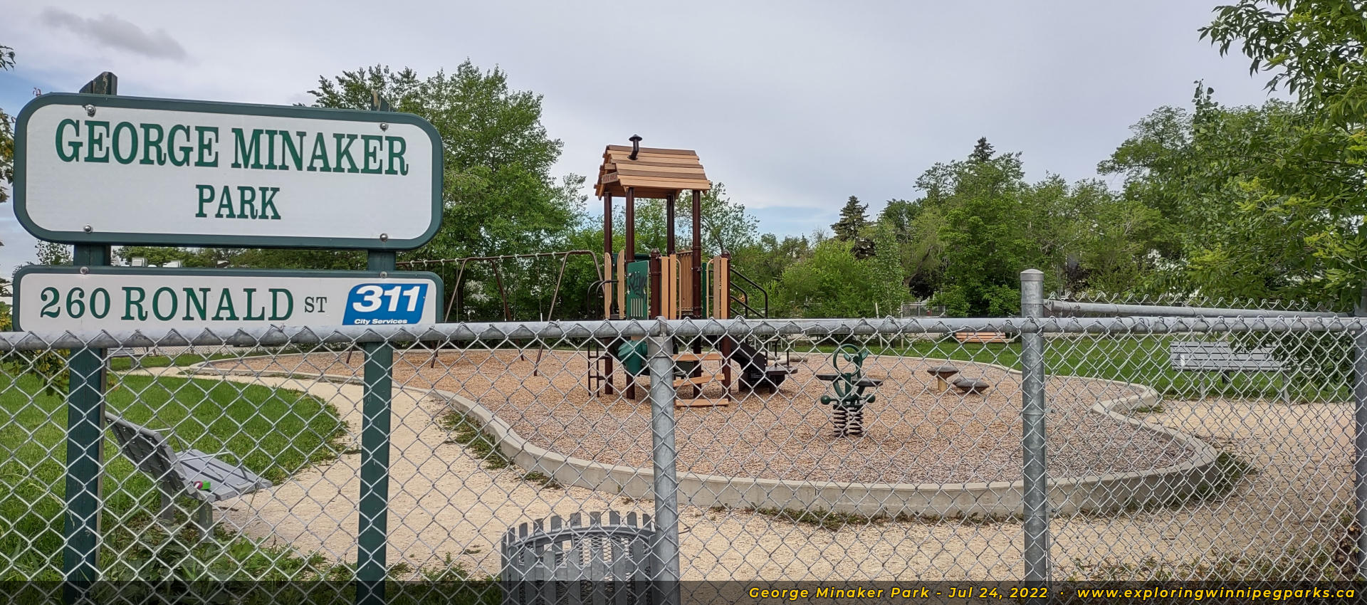 George Minaker Park sits on the northwest corner of the intersection between Lodge Ave and Ronald St, just north of the Courts of St. James. Several benches surround a playground.