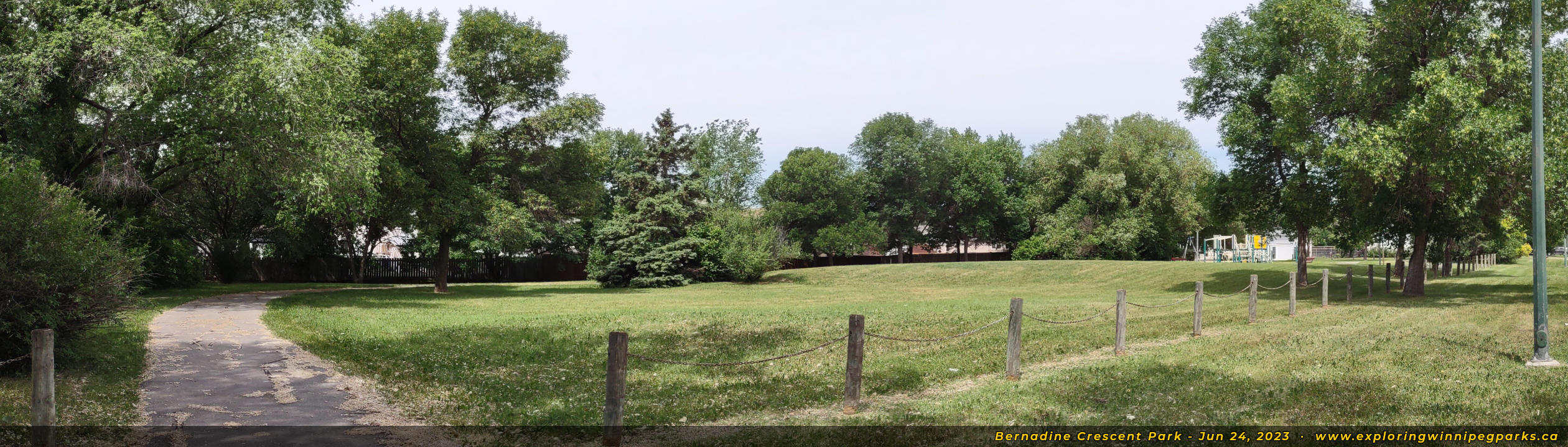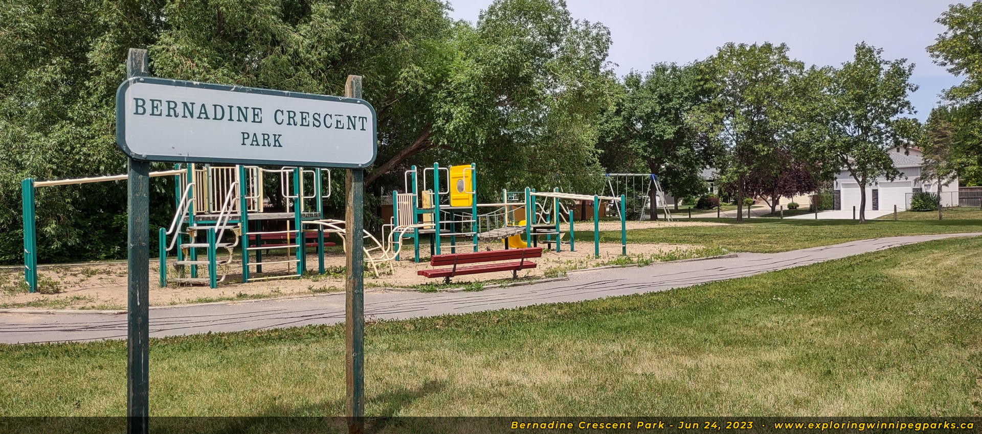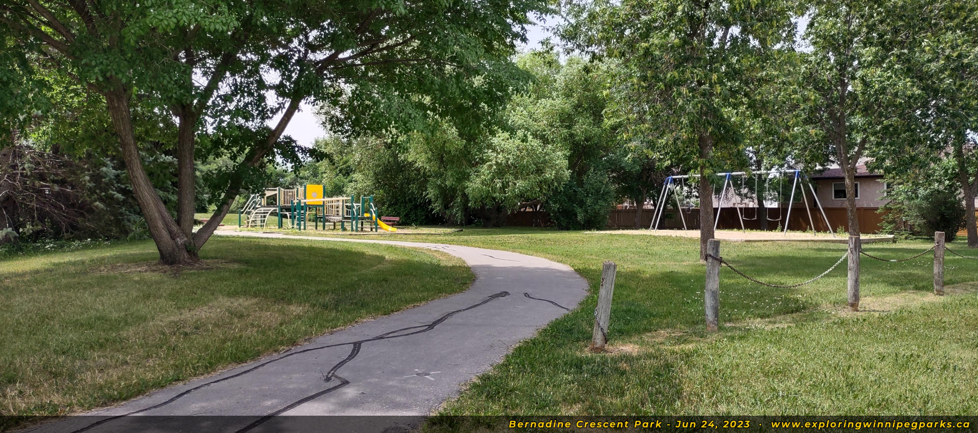 Bernadine Crescent Park is located on the west side of Bernadine Cres, at the intersection with Olson Way. A sidewalk winds its way past a playground and small open area.
