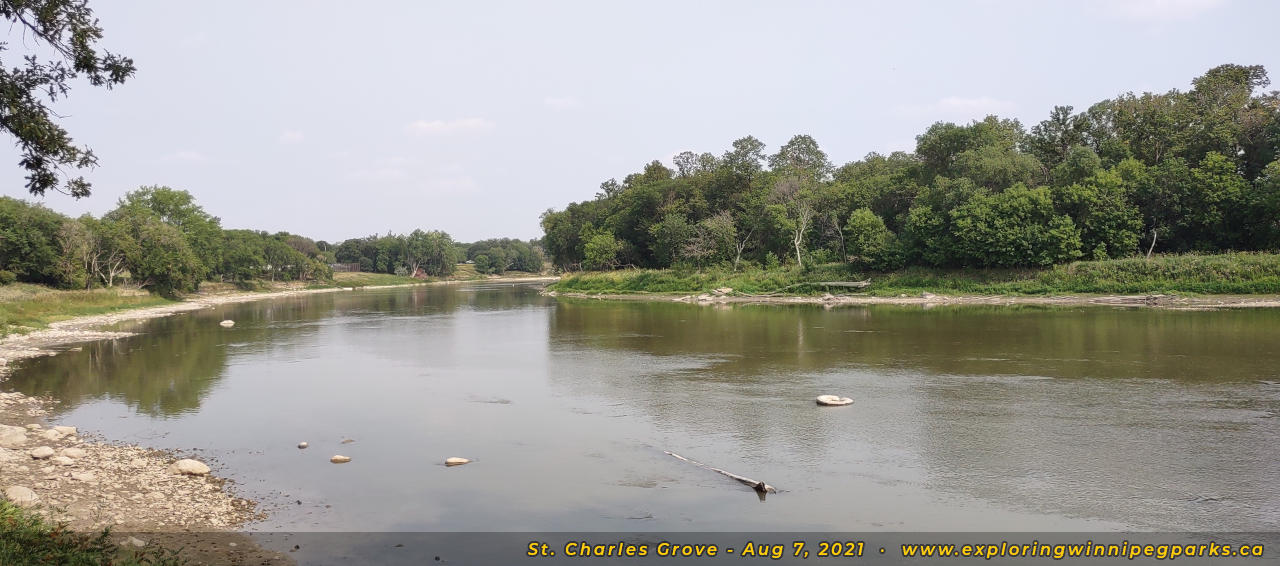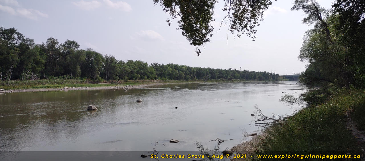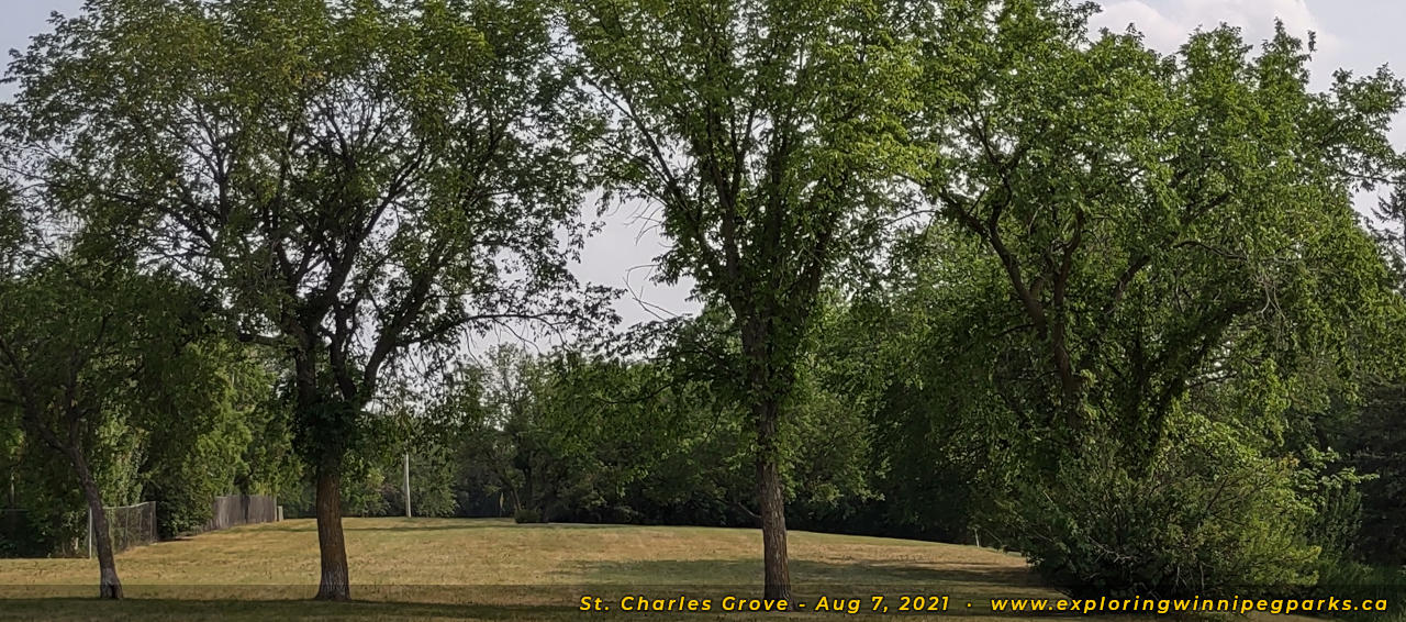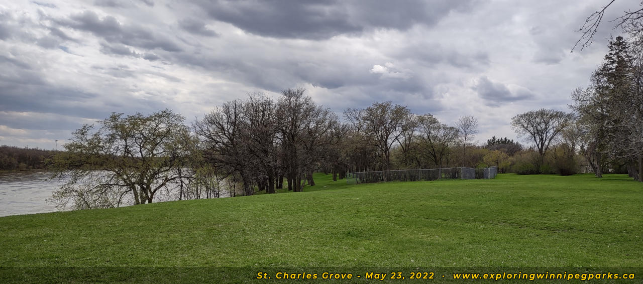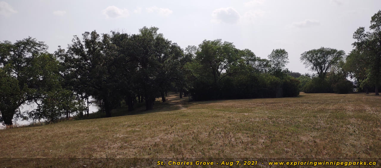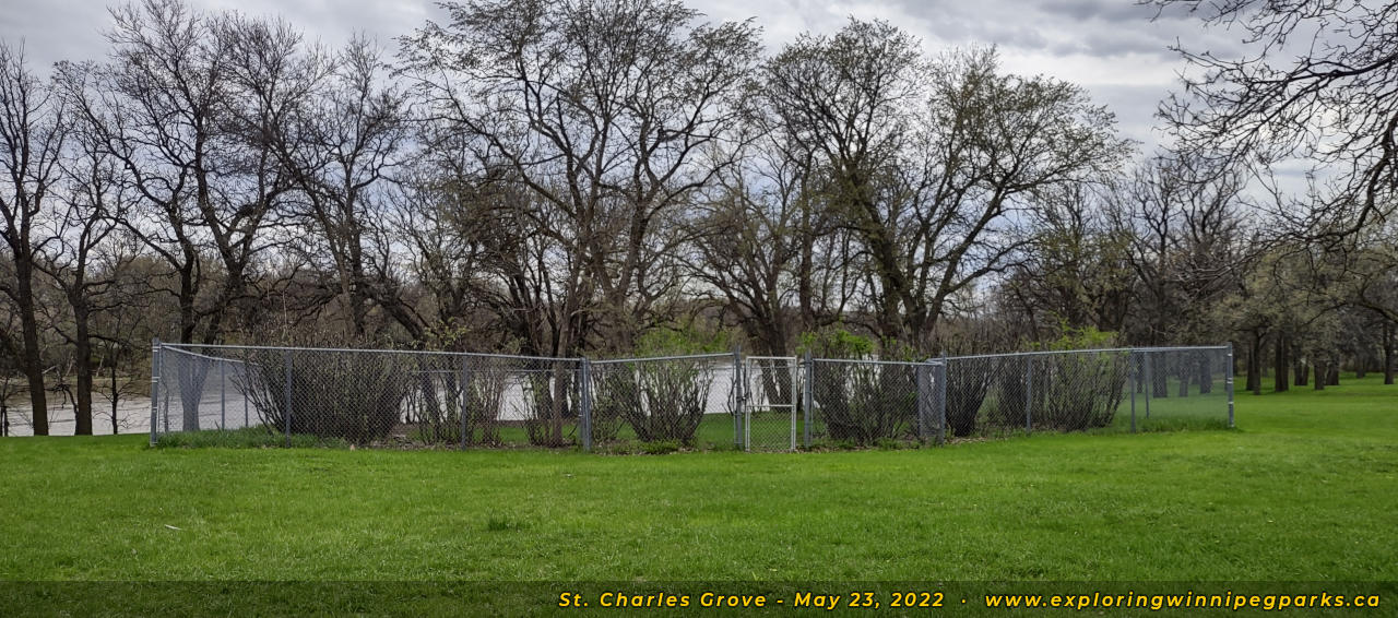 St. Charles Grove is located just inside the western perimeter, south of Portage Ave at the end of St. Charles St, on the north shore of the Assiniboine River. There's a large open area, a good view of the river, and access to a community garden via a dirt pathway to the southwest.