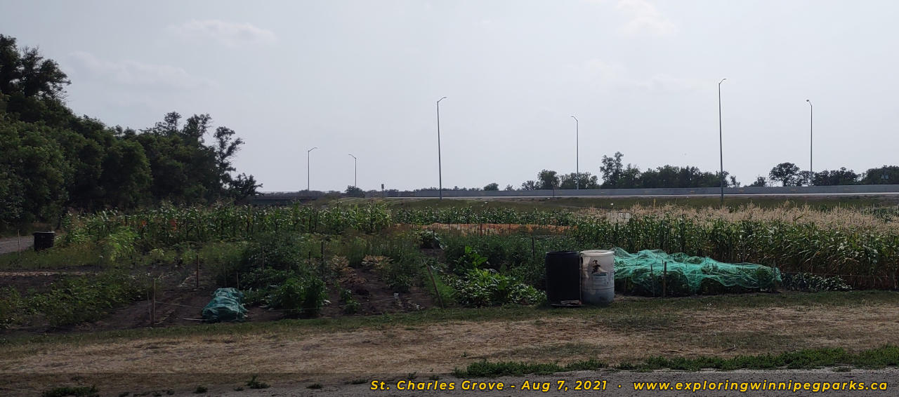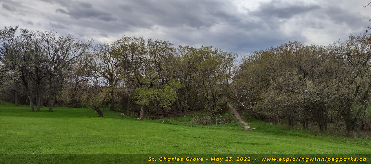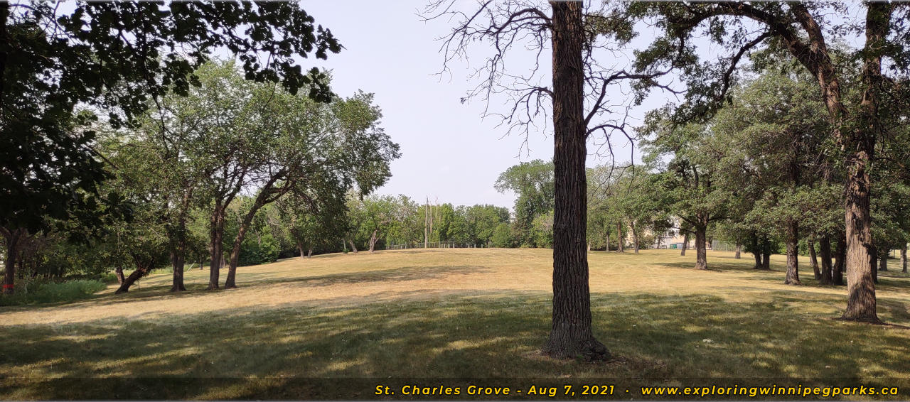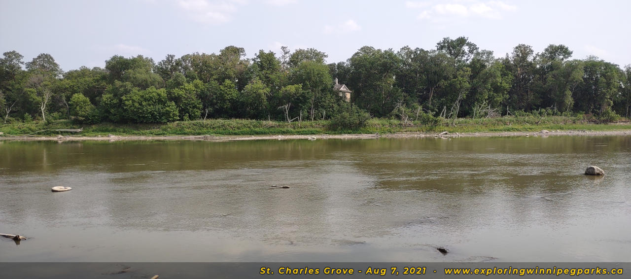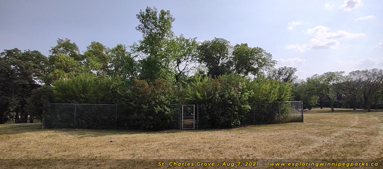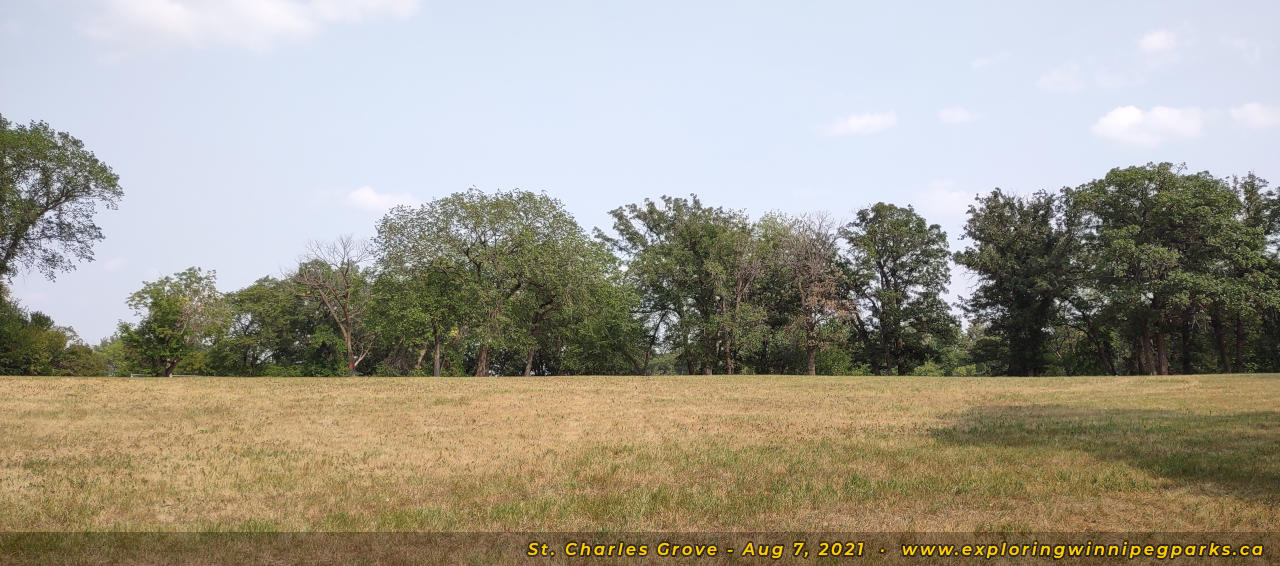 St. Charles Grove is located just inside the western perimeter, south of Portage Ave at the end of St. Charles St, on the north shore of the Assiniboine River. There's a large open area, a good view of the river, and access to a community garden via a dirt pathway to the southwest.