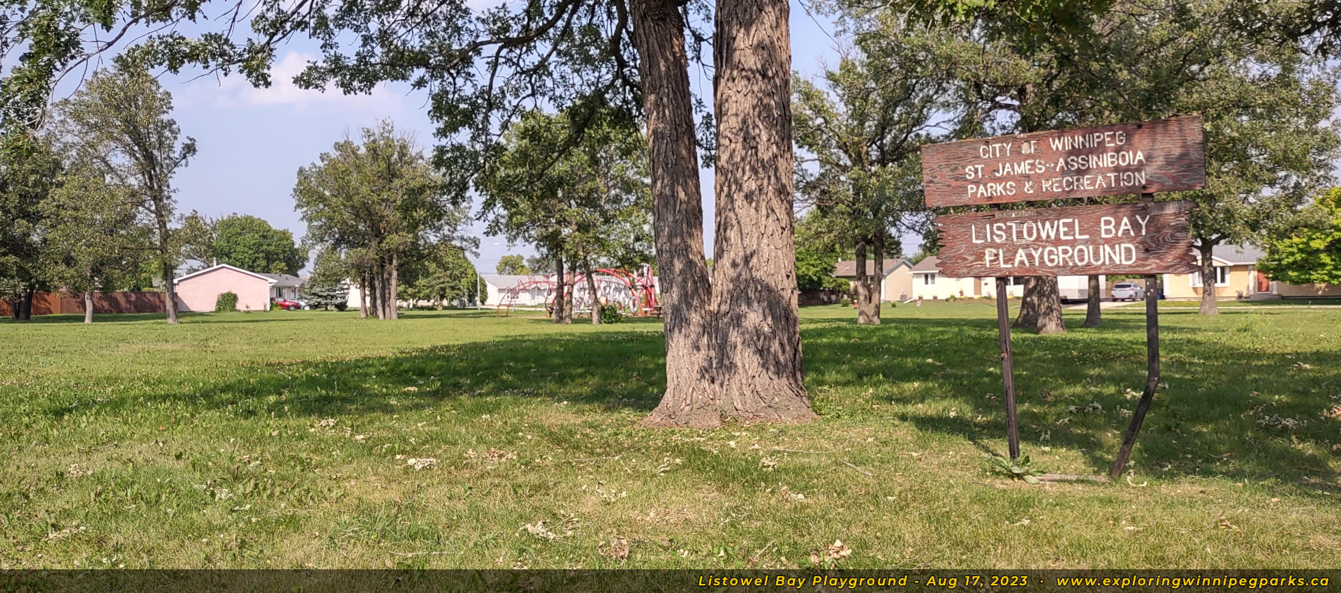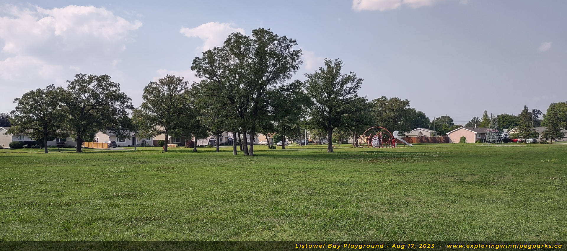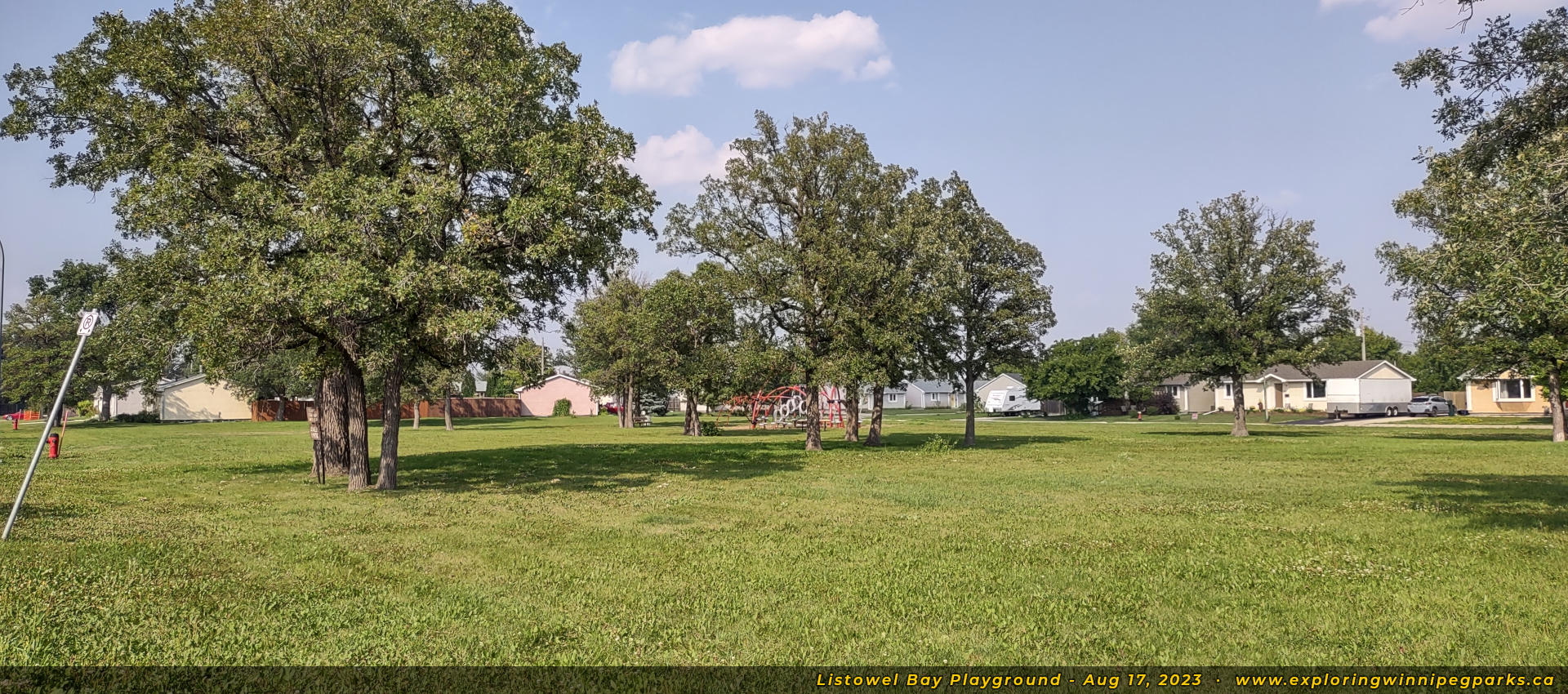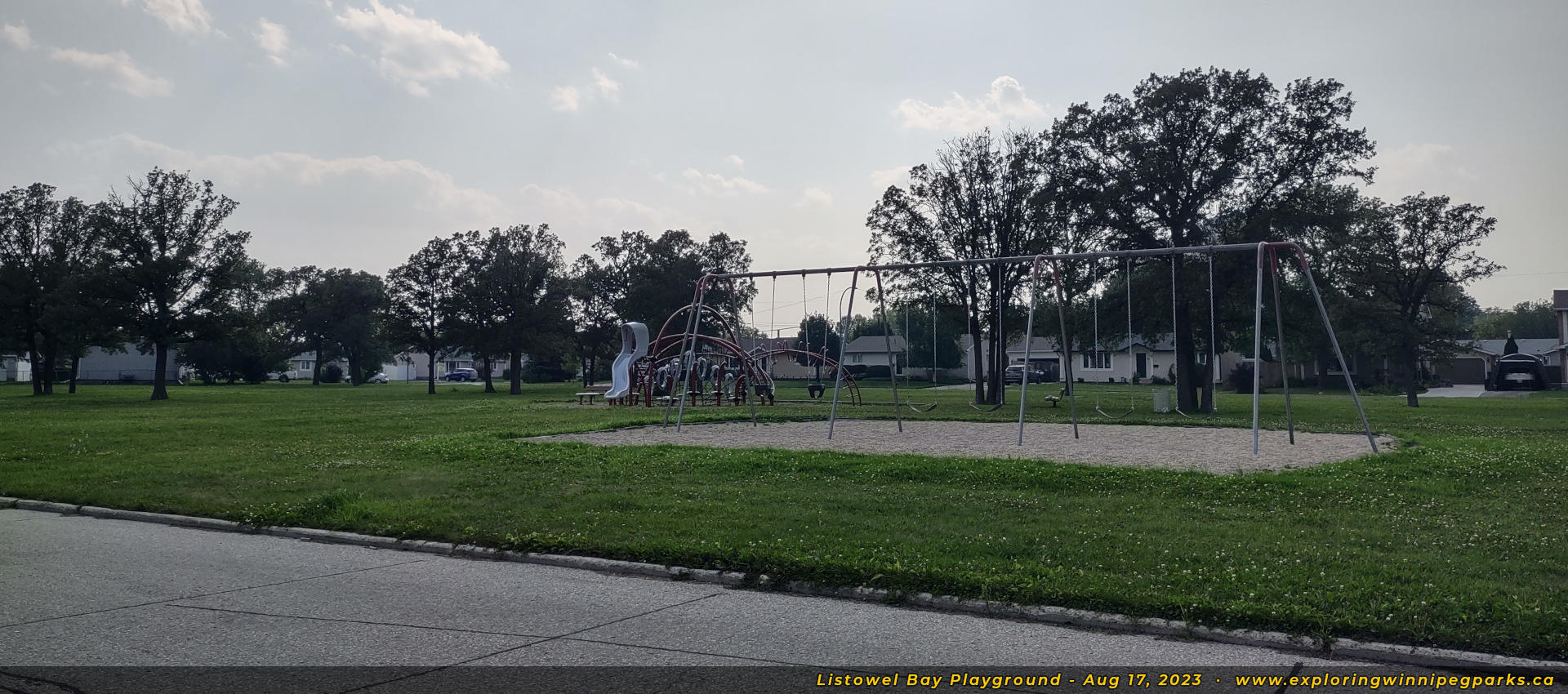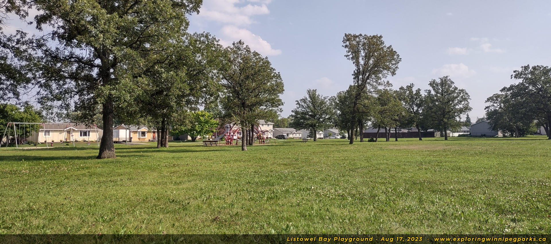 Listowel Bay Playground sits between Listowel Bay and Silverwood Bay, about two blocks north of Ness Ave, and two blocks south of the Yellow Ribbon Greenway. There's an open area surrounding a playground.