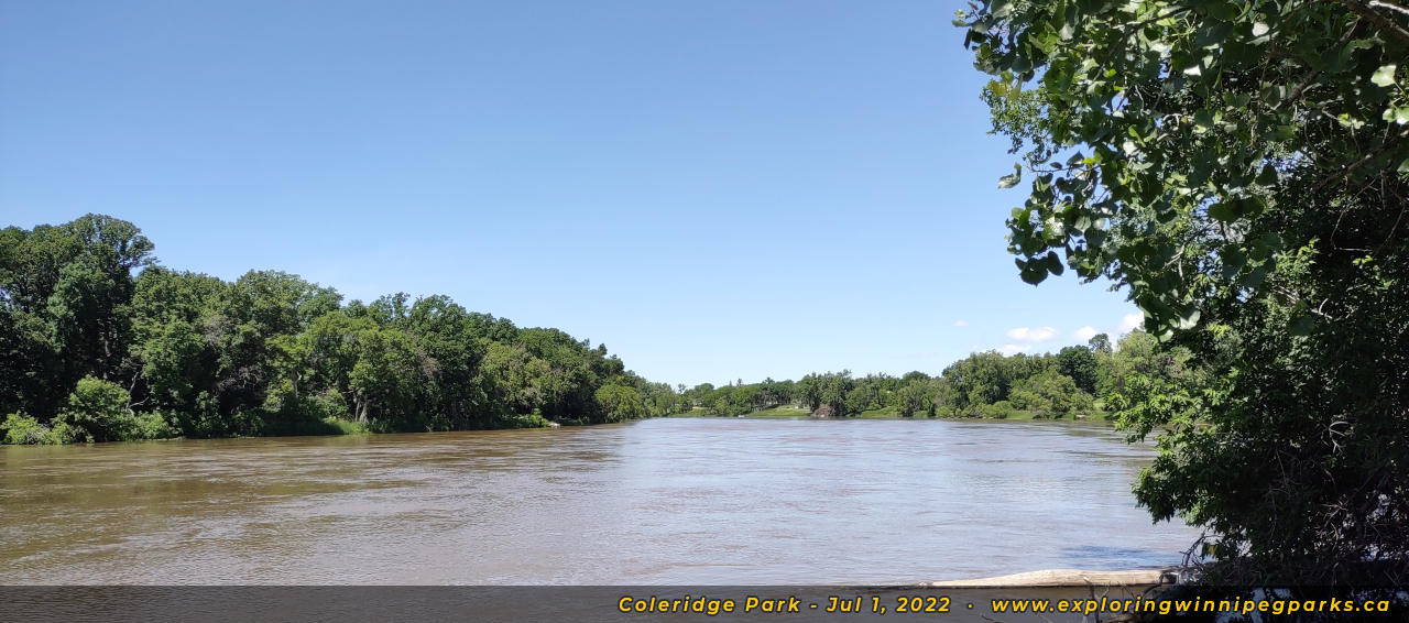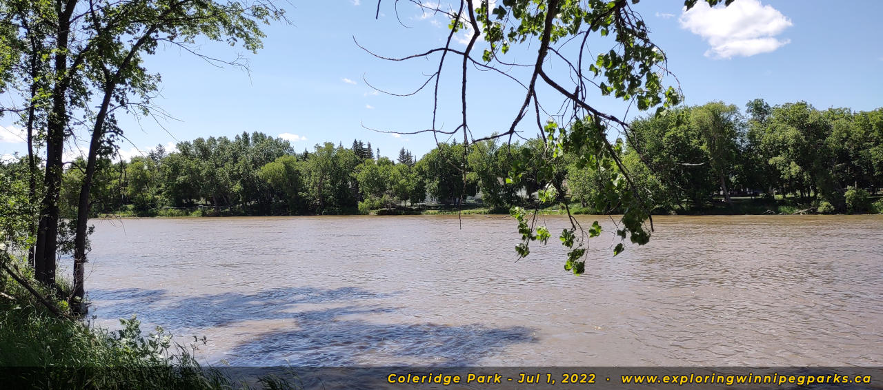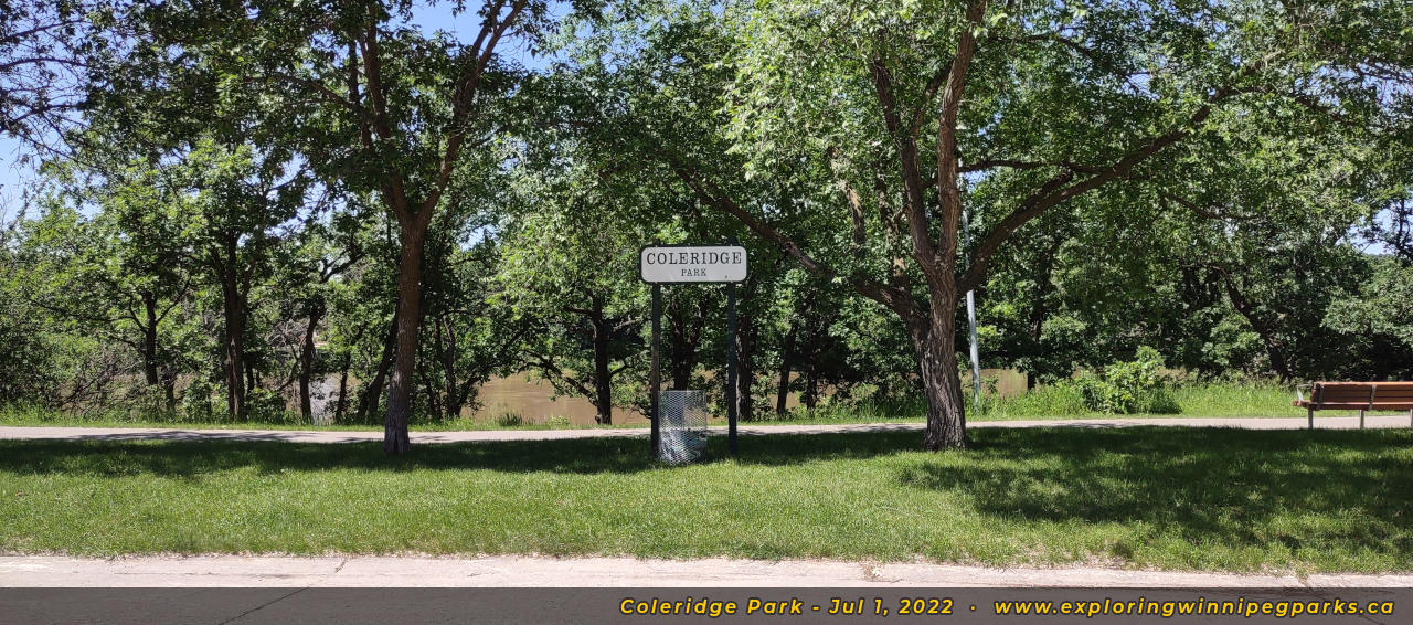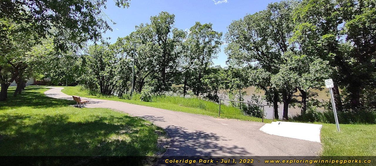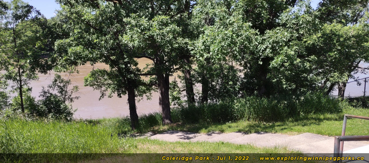 Coleridge Park sits on the north shore of the Assiniboine River along Coleridge Park Dr, south of Portage Ave towards the south end of Bedson St. There's a sidewalk spanning the length of the park, with pathways leading down to a view of the river.