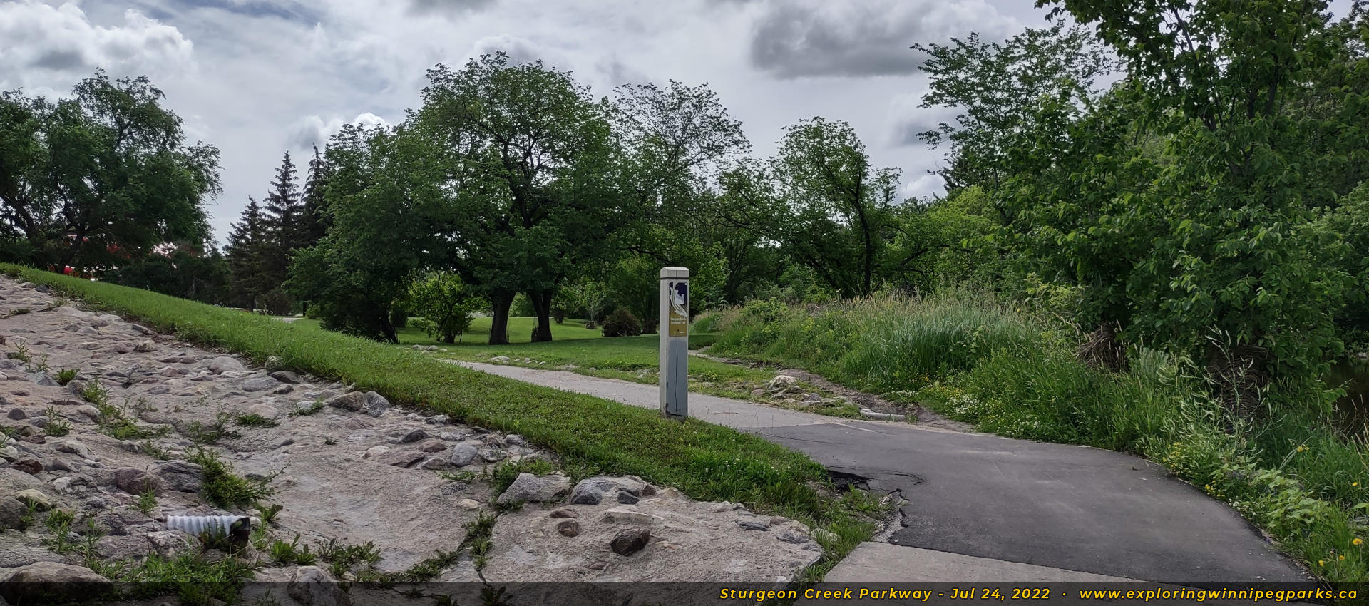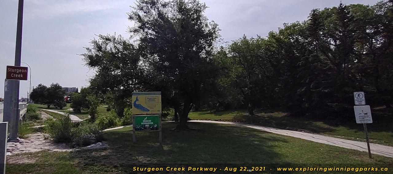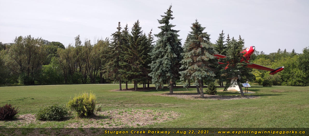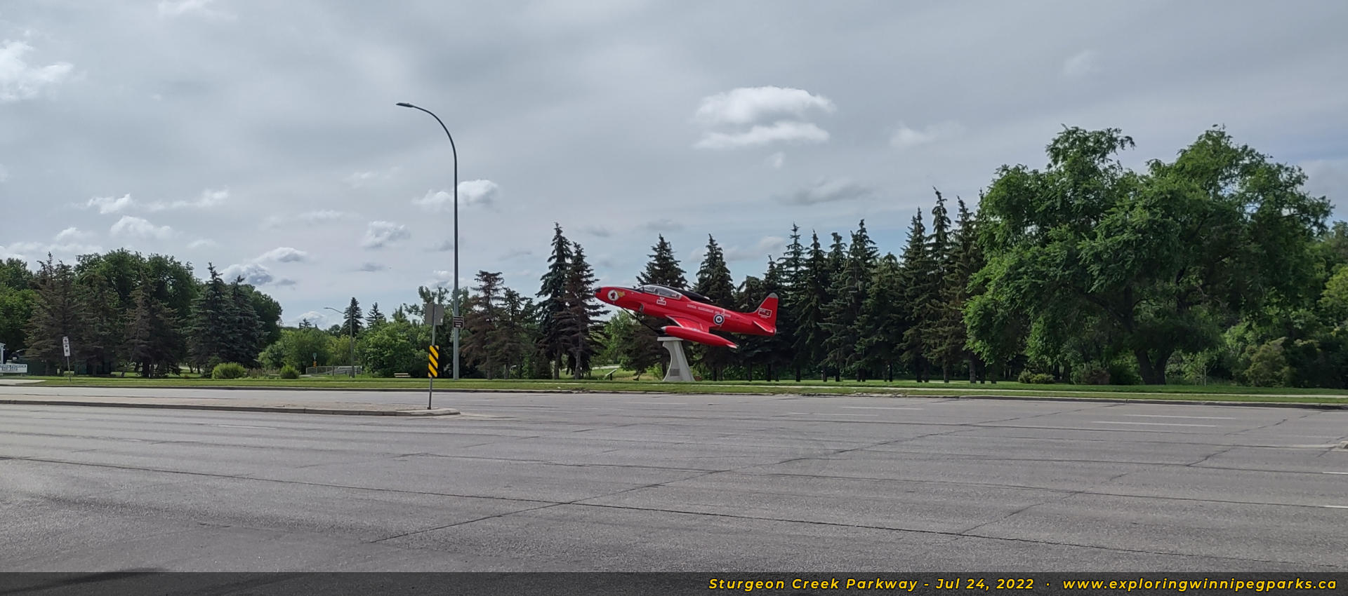 The southern-most section of the Sturgeon Creek Parkway is located on the south side of Portage Ave, across from Grant's Old Mill and the Courts of St James. There's a large open area, planted flowers, and the T-33 jet monument named the Red Knight.