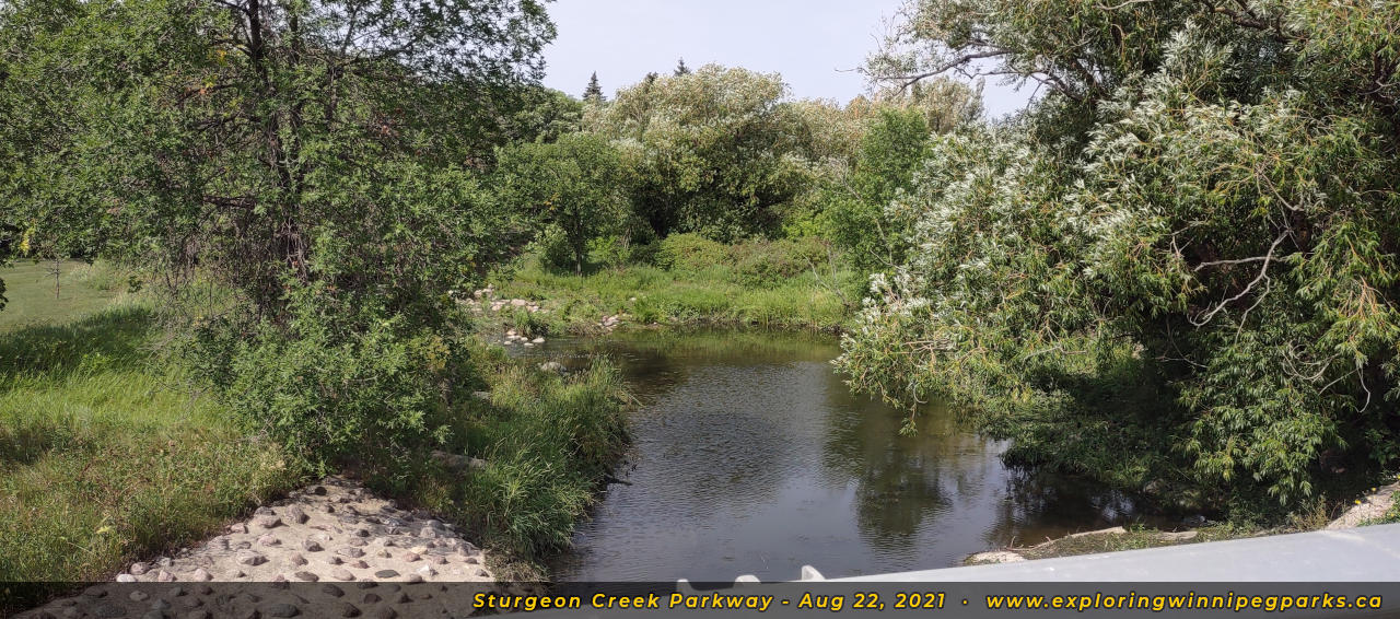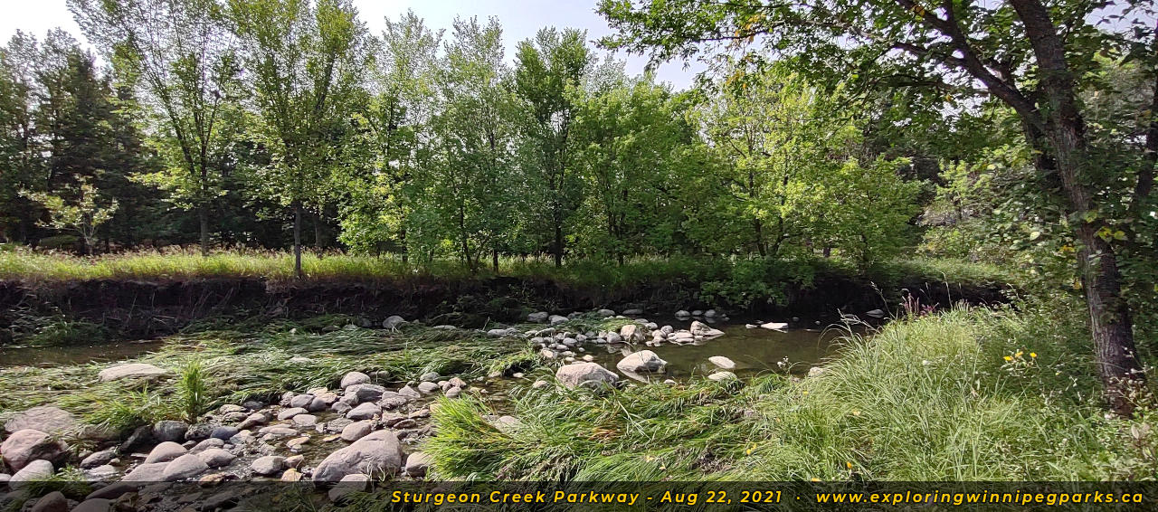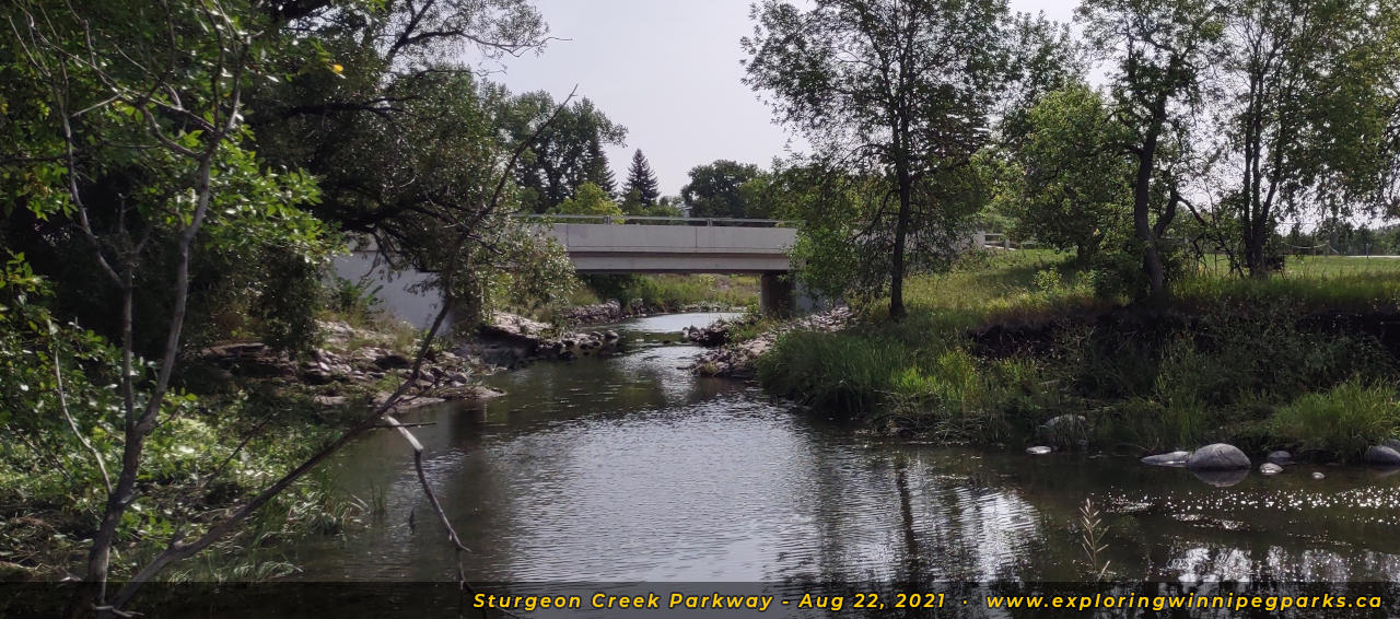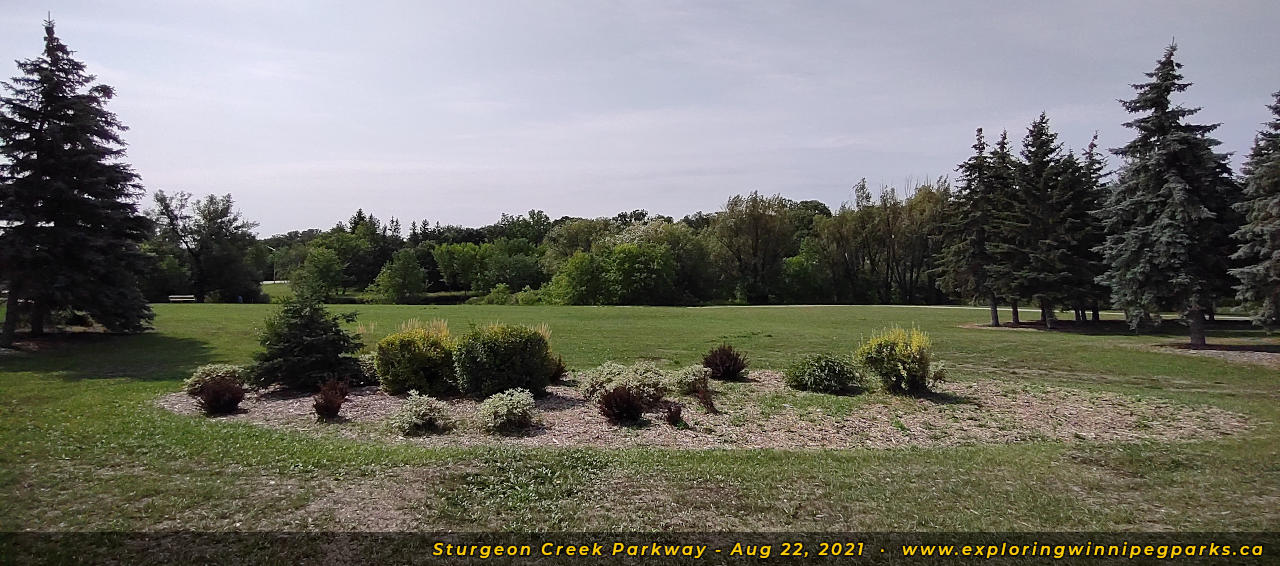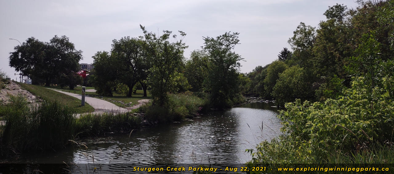 The southern-most section of the Sturgeon Creek Parkway is located on the south side of Portage Ave, across from Grant's Old Mill and the Courts of St James. There's a large open area, planted flowers, and the T-33 jet monument named the Red Knight.